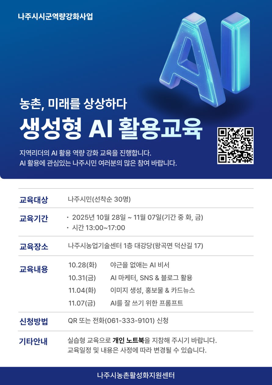 농촌활성화지원센터 생성형 AI 활용 교육생 모집 2025.10.23 10:34 나주농업진흥재단 농촌활성화지원센터에서 생성형 AI 활용 교육생을 모집합니다. 이미지를 참고하여 많은 신청 부탁드립니다. File 생성형 AI 활용교육생 모집 포스터.jpg (123.05 KB) 다음글 : 행정안전부 고시 「안전관리헌장」 이전글 : 2025년 미래로가는 전남농업 5-6월호(전라남도농업기술원)