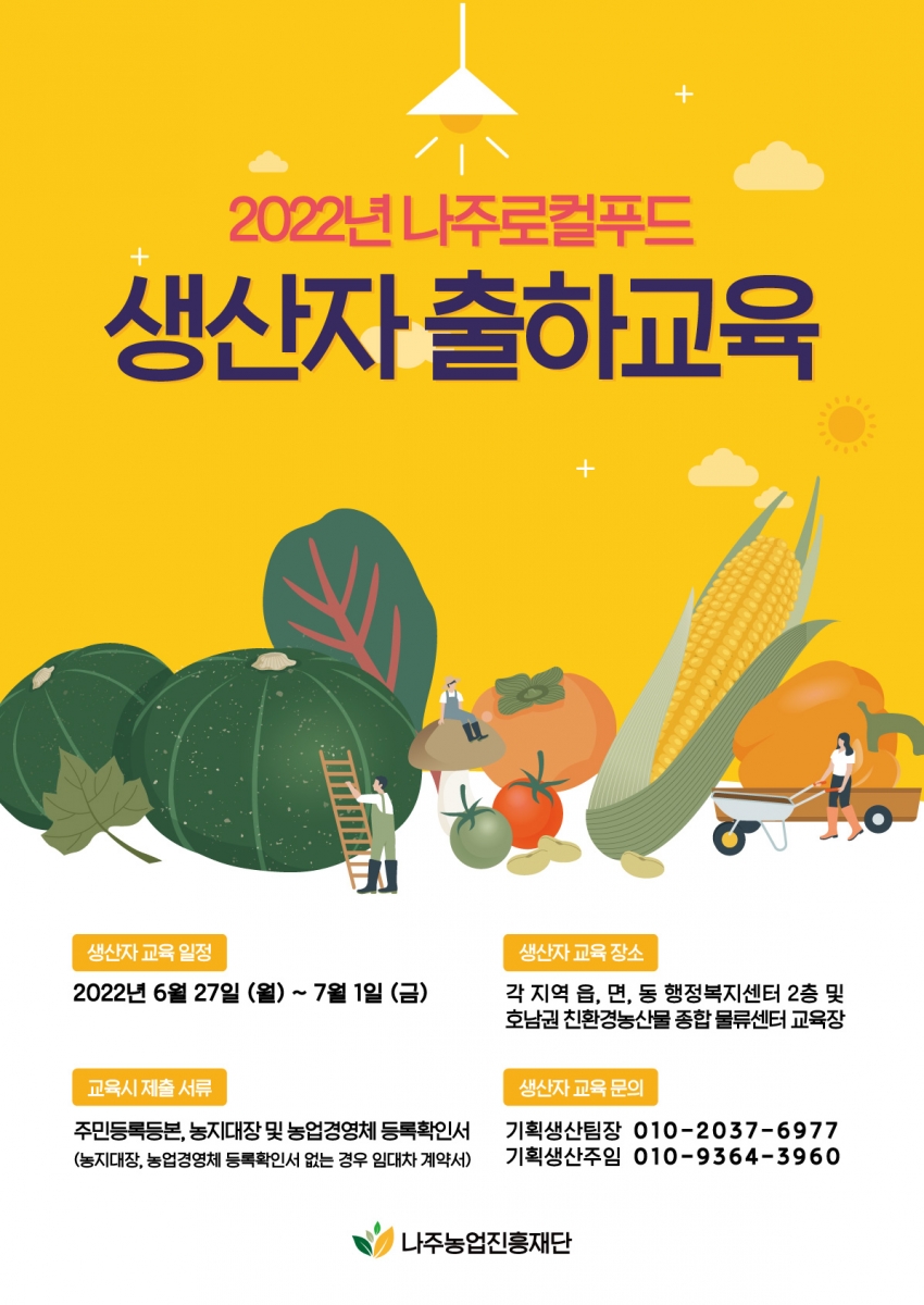 2022년 나주로컬푸드 생산자 출하교육 포스터 2022.06.22 13:58 2022년 나주로컬푸드 생산자 출하교육 포스터입니다. File 22년 생산자 교육.pdf (3.97 MB) 22년-생산자-교육.jpg (485 KB) 다음글 : 나주시 쇼핑몰 오색마을 입점안내 포스터 이전글 : [CI] 나주농업진흥재단 CI 파일