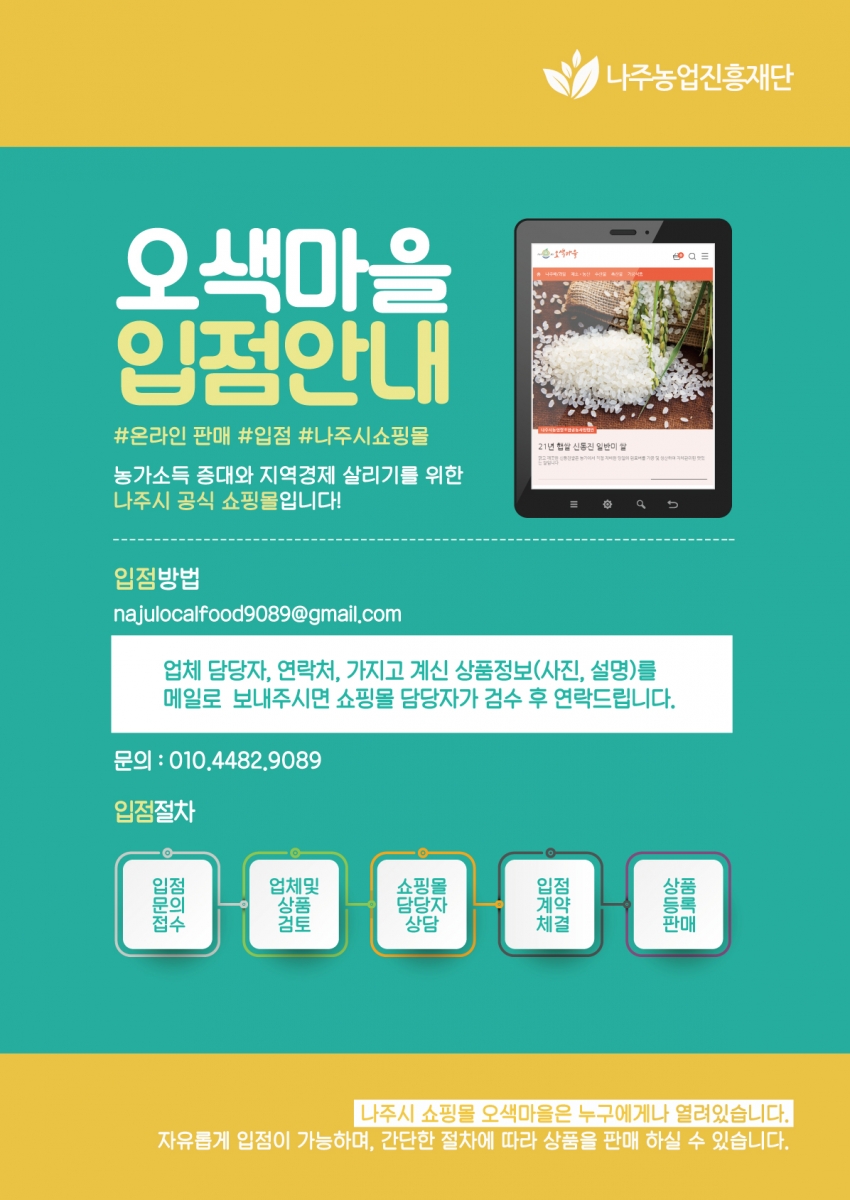 나주시 쇼핑몰 오색마을 입점안내 포스터 2022.06.27 14:00 나주시 쇼핑몰 오색마을 입점안내 포스터입니다. File 오색마을입점안내포스터.pdf (3.73 MB) 오색마을입점안내_포스터.jpg (474.9 KB) 다음글 : 국민권익위원회 부패·공익신고 안내 이전글 : 2022년 나주로컬푸드 생산자 출하교육 포스터