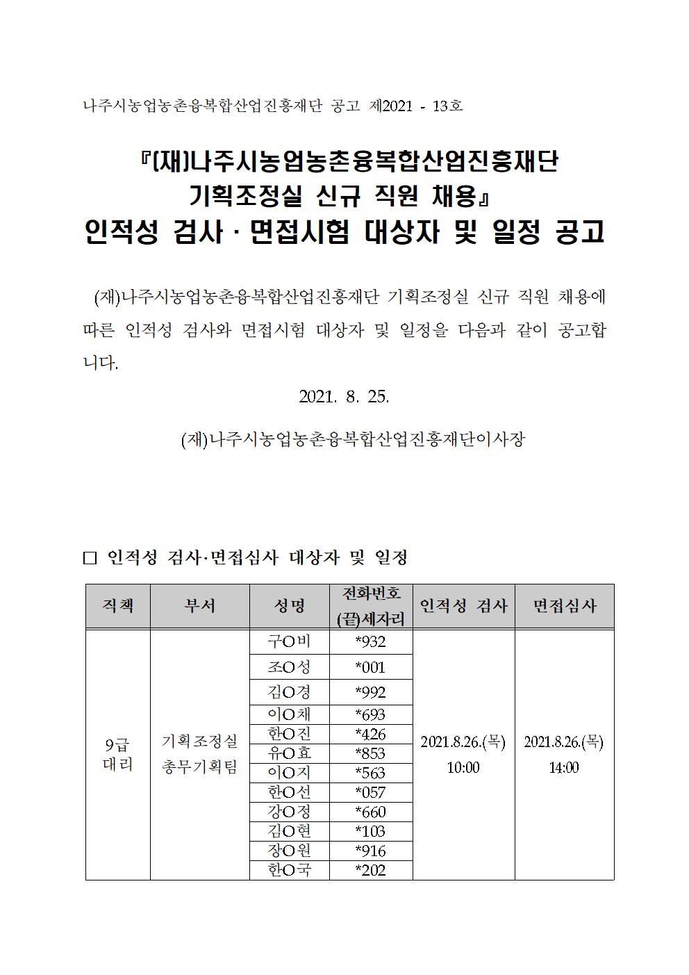 나주농업진흥재단 기획조정실 신규직원 채용 인적성검사,면접시험 대상자 및 일정 공고 2021.08.25 11:20 다음글 : 로컬푸드지원센터 추석명절 직매장 판촉행사 진행요원(기간제근로자) 모집 공고 이전글 : 나주농업진흥재단 공공급식지원센터 물류배송팀 기간제 근로자 채용 재공고