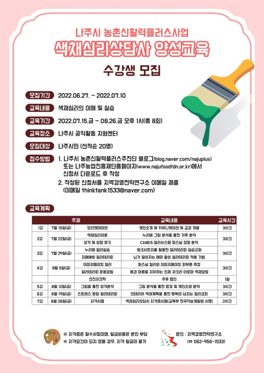 2022년 나주시 농촌신활력플러스사업 색채심리상담사 양성교육생 모집 공고 2022.06.27 10:09 File [공고문]2022년 나주시 농촌신활력플러스사업 색채심리상담사 양성교육생 모집 공고.pdf (91.85 KB) 붙임1. 색채심리상담사 양성교육 참여신청서.hwp (64 KB) 붙임2. 색채심리상담사 양성교육 홍보지.jpg (524.15 KB) 다음글 : 2022년 나주시 농촌신활력플러스사업 아동요리지도사 양성교육생 모집 공고 이전글 : (재)나주시농업농촌융복합산업진흥재단 천연색소산업화지원센터 입주기업 모집 공고