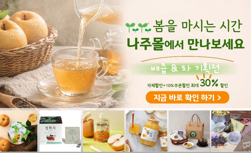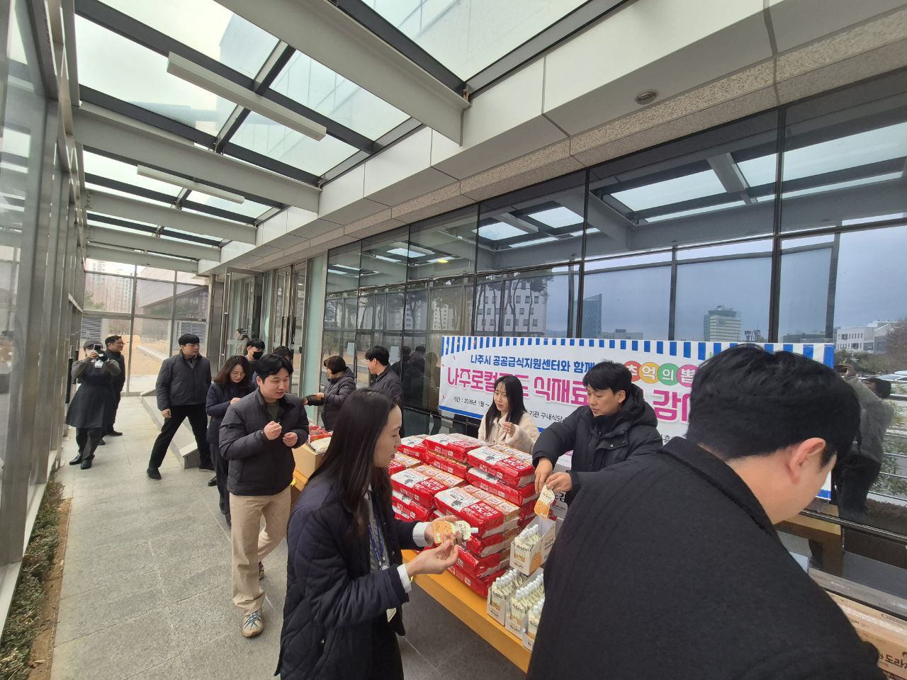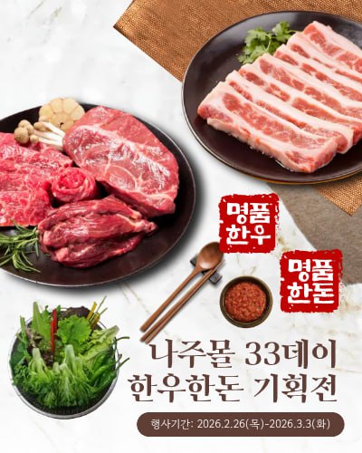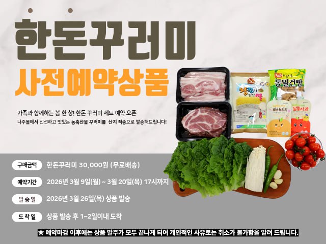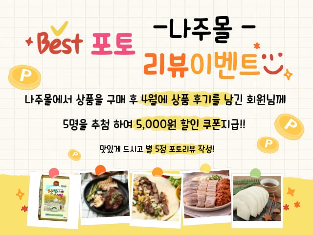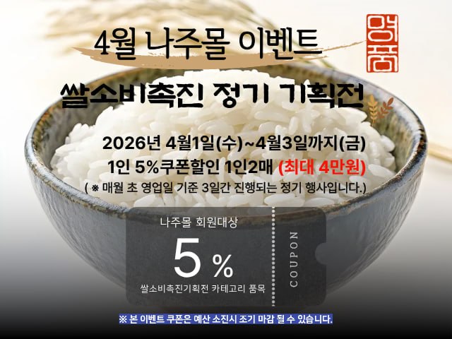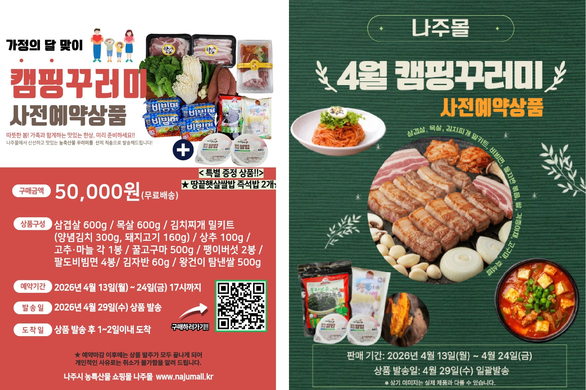 나주몰 캠핑꾸러미 사전예약 2026.04.13 나주몰 4월 행사 2026.04.01 +1 직거래장터(로컬푸드직매장 이전기념 ‘생산자·소비자 화합의 날’) 2026.03.28 +3 나주몰 3월 행사 2026.03.01 +1 2026년 농산물 가공 제품 개발 교육 2026.02.23 +7 한국농어촌공사 로컬푸드데이 2026.01.19 나주시청(설명절 선물세트 직거래장터) 2026.02.13 한국콘텐츠진흥원(설명절 선물세트 직거래장터) 2026.02.05