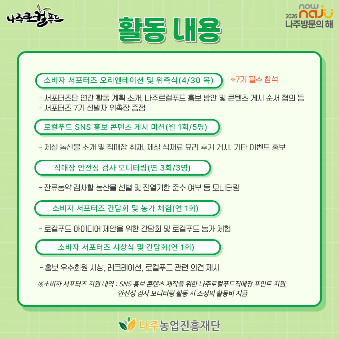 ●활동내용: 나주로컬푸드 홍보, 직매장 모니터링 및 의견 제안, 로컬푸드 식문화 발굴 및 전파, 생산자와 교류 활동 등
