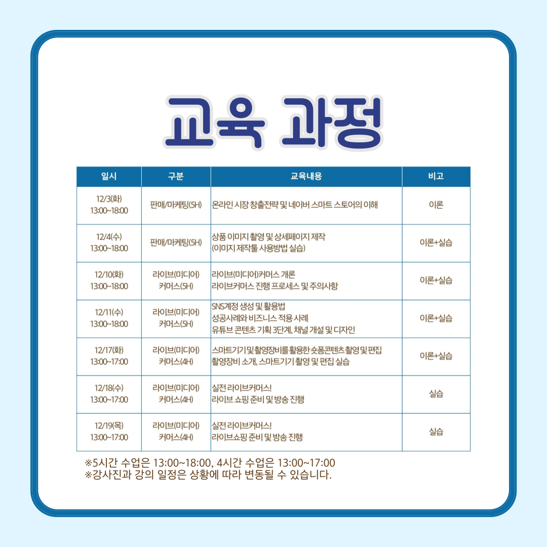 ●교육기간 : 2024. 12. 3.(화), 12. 4.(수) / 12. 10.(화), 12. 11.(수) / 12. 17.(화) ~ 12. 19.(목), 총 7회