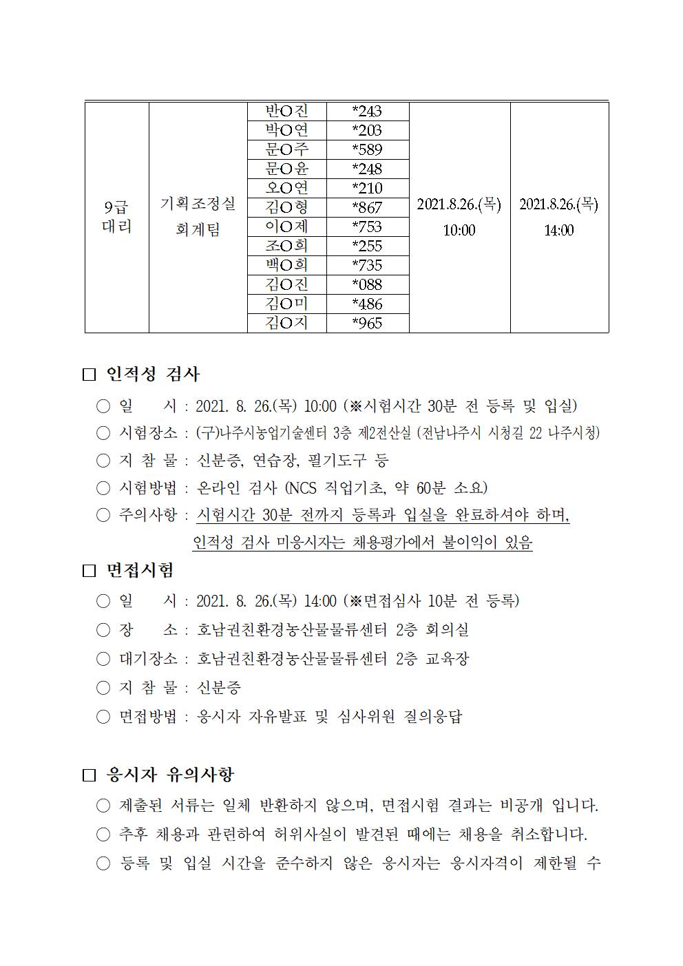 나주농업진흥재단 기획조정실 신규직원 채용 인적성검사,면접시험 대상자 및 일정 공고 2021.08.25 11:20 다음글 : 로컬푸드지원센터 추석명절 직매장 판촉행사 진행요원(기간제근로자) 모집 공고 이전글 : 나주농업진흥재단 공공급식지원센터 물류배송팀 기간제 근로자 채용 재공고