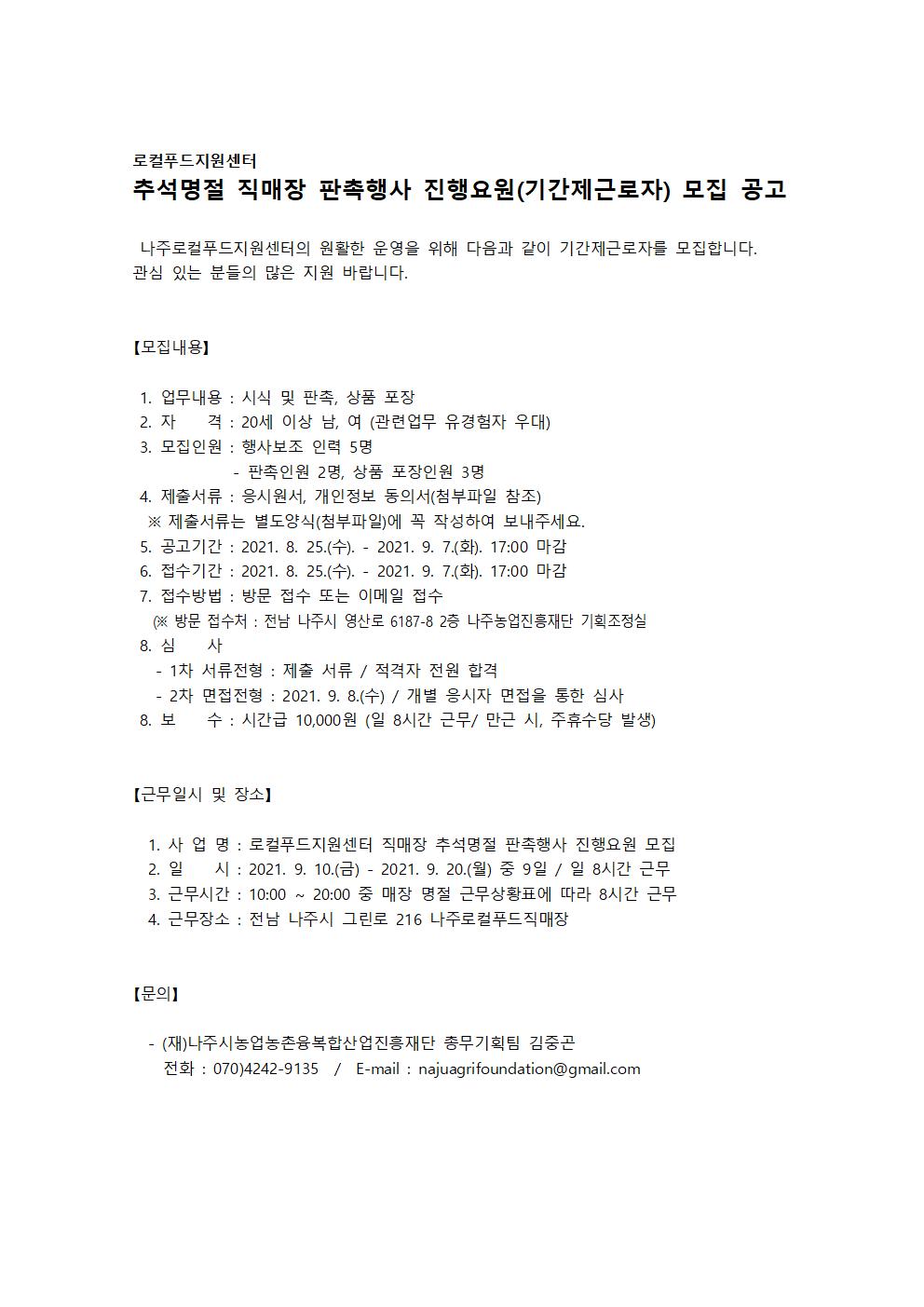 로컬푸드지원센터 추석명절 직매장 판촉행사 진행요원(기간제근로자) 모집 공고 2021.08.25 13:31 File 붙임 2.기간제 근로자 응시원서.hwp (47.5 KB) 다음글 : 나주농업진흥재단 기획조정실 신규 채용 최종합격자 공고 이전글 : 나주농업진흥재단 기획조정실 신규직원 채용 인적성검사,면접시험 대상자 및 일정 공고