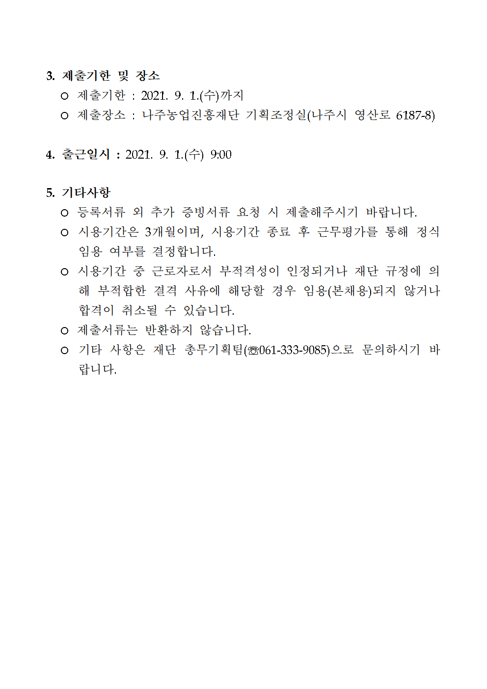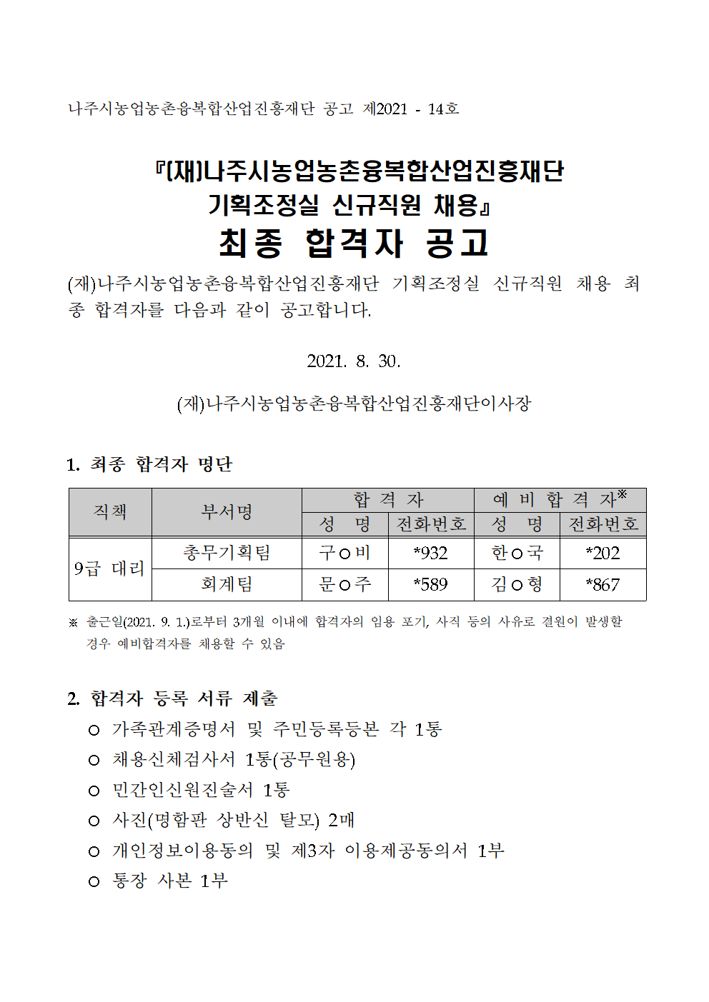 나주농업진흥재단 기획조정실 신규 채용 최종합격자 공고 2021.08.30 12:54 File 민원인 신원진술서 및 개인정보이용 동의서.hwp (54 KB) 다음글 : 나주농업진흥재단 기획조정실 회계팀 신규직원 채용 공고 이전글 : 로컬푸드지원센터 추석명절 직매장 판촉행사 진행요원(기간제근로자) 모집 공고