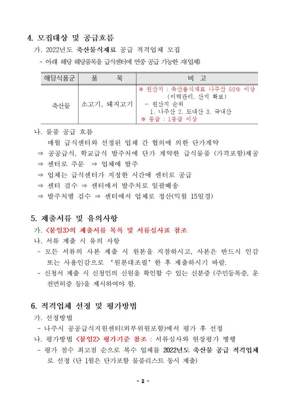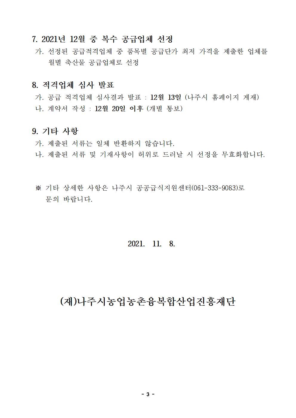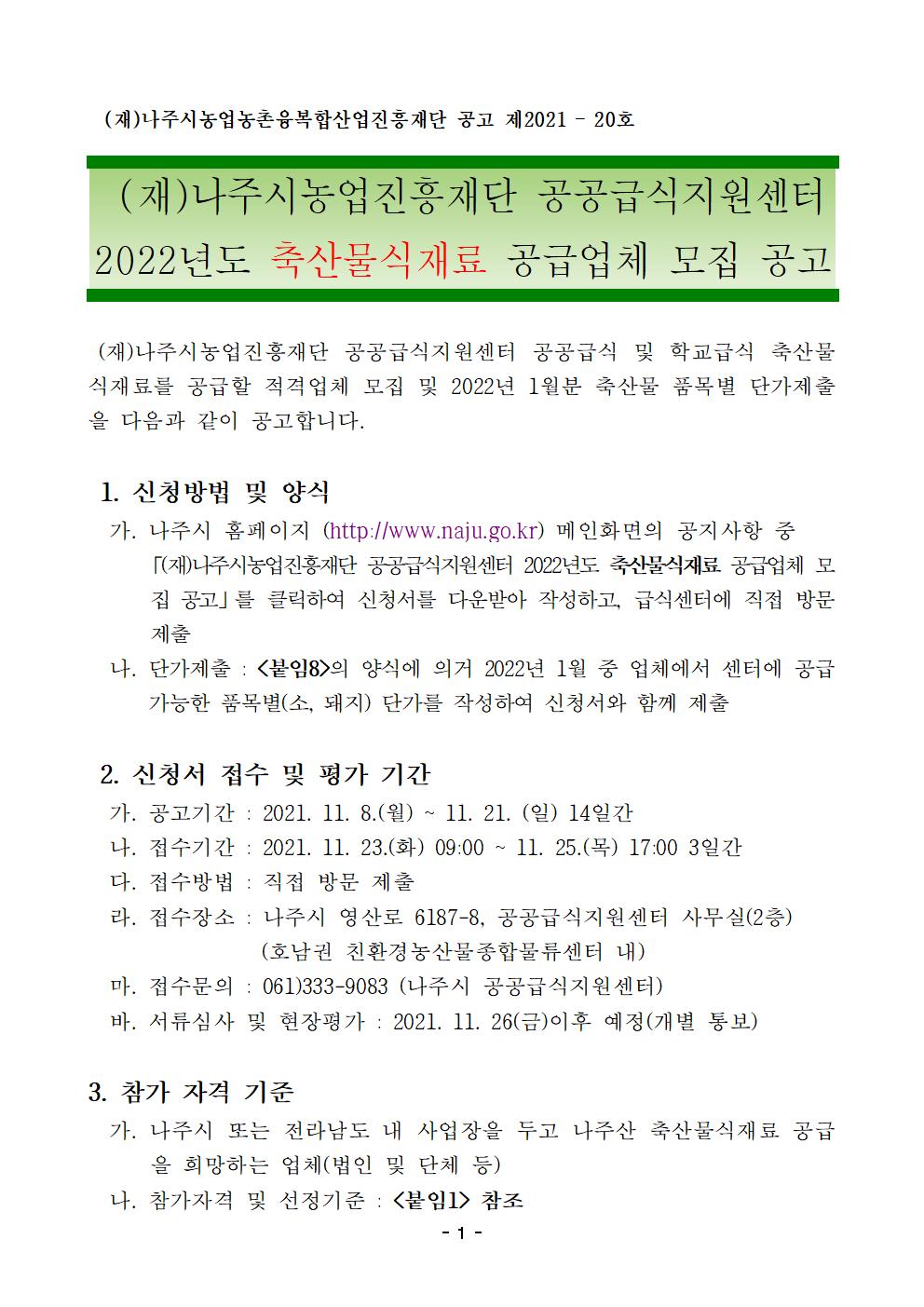 나주농업진흥재단 공공급식지원센터 2022년도 축산물식재료 공급업체 모집 공고 2021.11.08 11:00 File 축산물 모집공고 붙임문서.hwp (50 KB) 다음글 : (재)나주시농업농촌융복합산업진흥재단 공공급식지원센터 기간제근로자 채용 공고 이전글 : 나주농업진흥재단 부이사장 채용 서류심사 합격자 공고