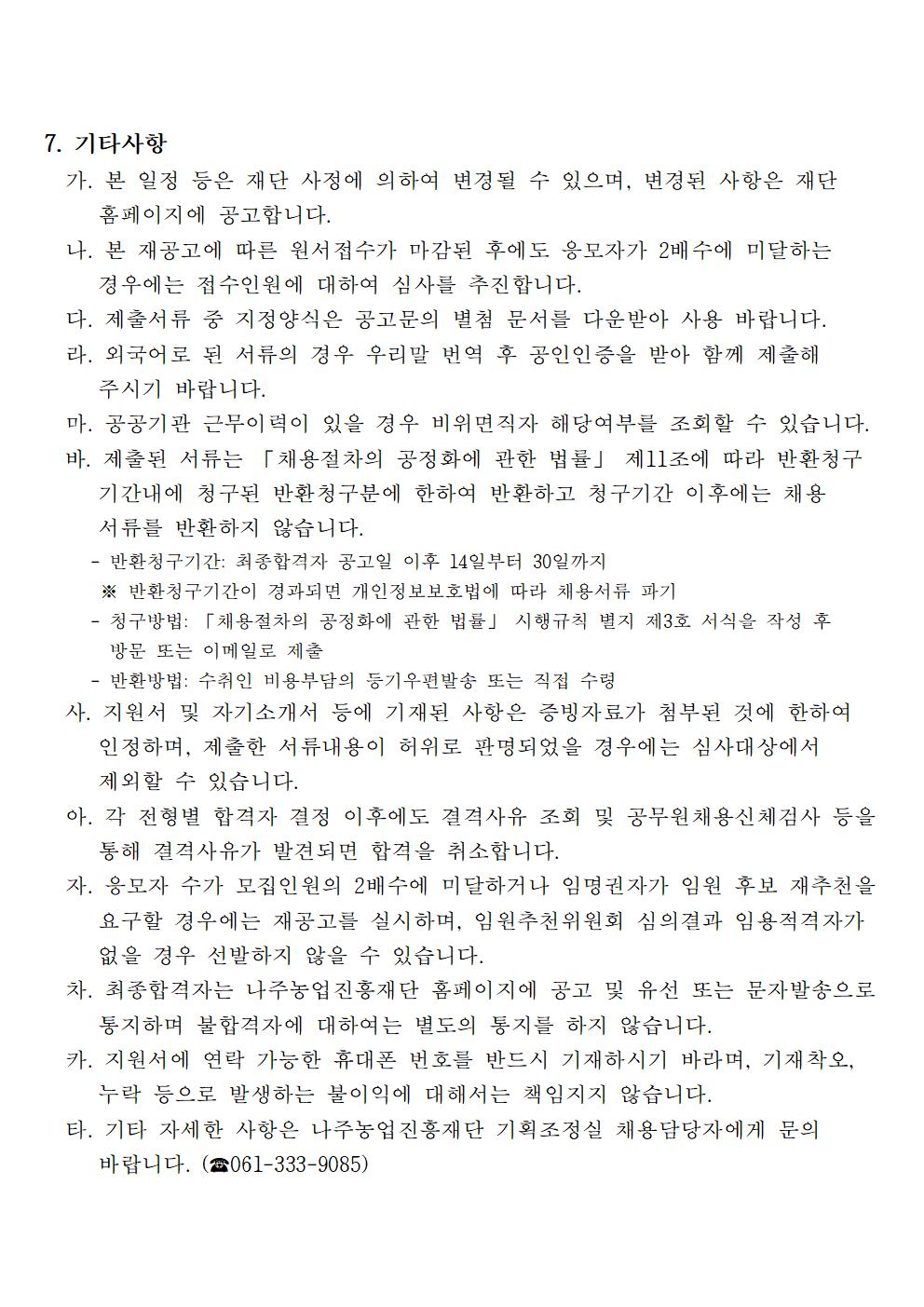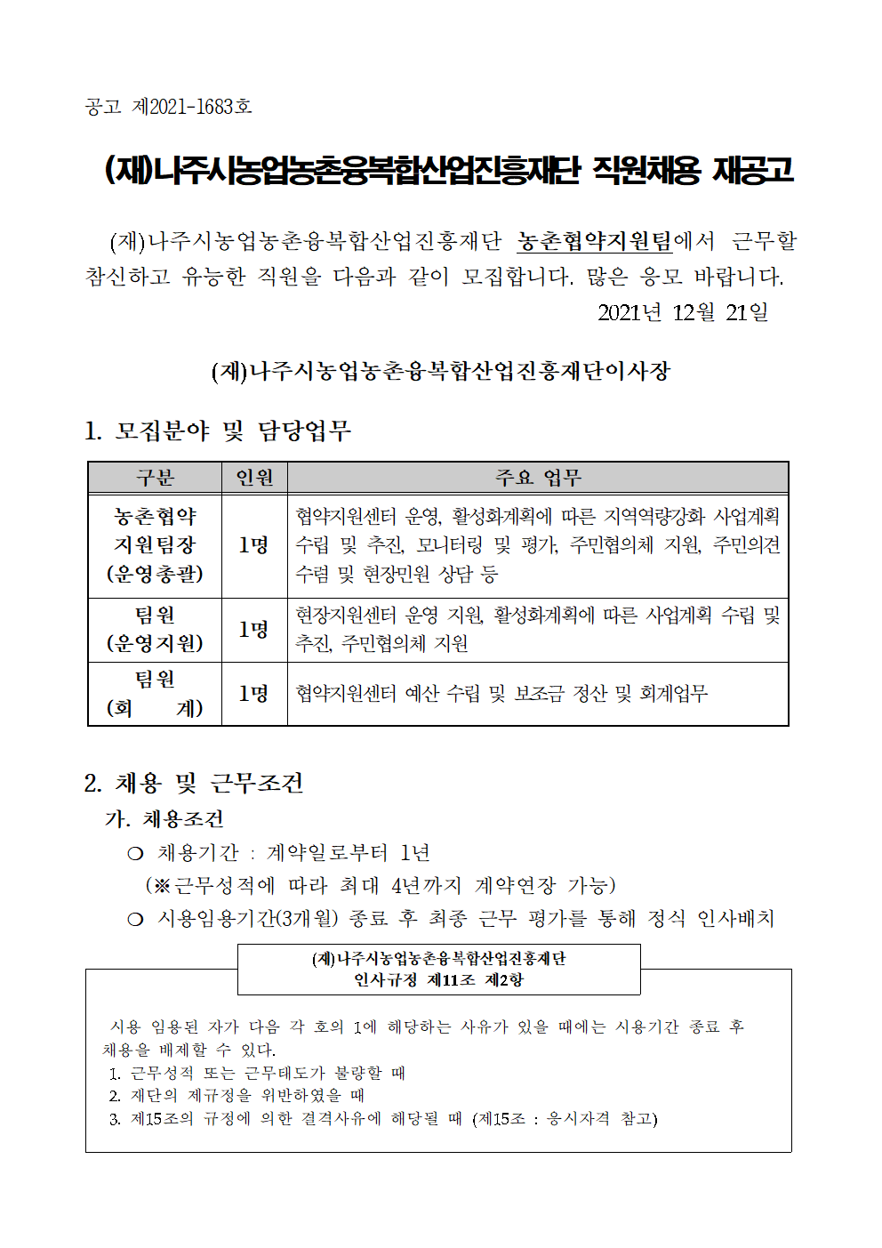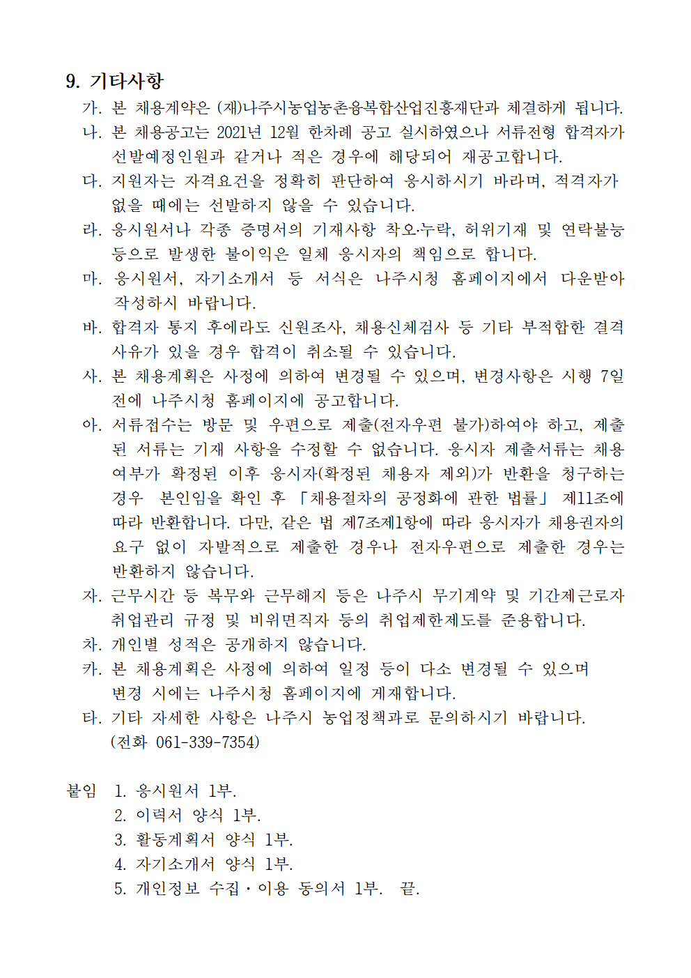 나주농업진흥재단 농촌협약지원팀 직원채용 재공고 2021.12.21 16:20 File 채용 붙임서류.hwp (26.5 KB) 다음글 : 나주농업진흥재단 기획조정실 기간제근로자 채용 재공고 이전글 : (재)나주시농업농촌융복합산업진흥재단 부이사장 채용 재공고