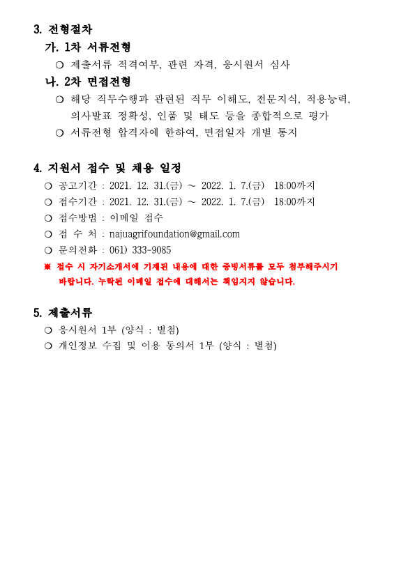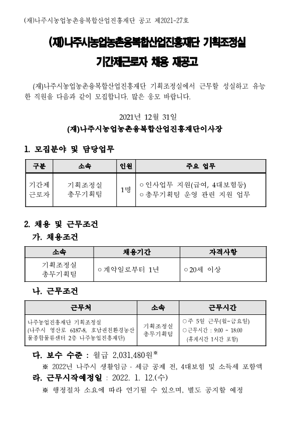 나주농업진흥재단 기획조정실 기간제근로자 채용 재공고 2021.12.31 10:17 File 채용 붙임문서.hwp (17 KB) 다음글 : 나주농업진흥재단 설명절 직매장 판촉행사 진행요원(기간제근로자) 모집 공고 이전글 : 나주농업진흥재단 농촌협약지원팀 직원채용 재공고