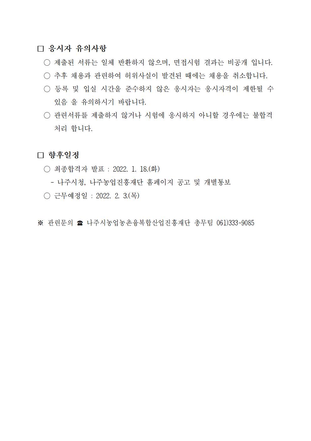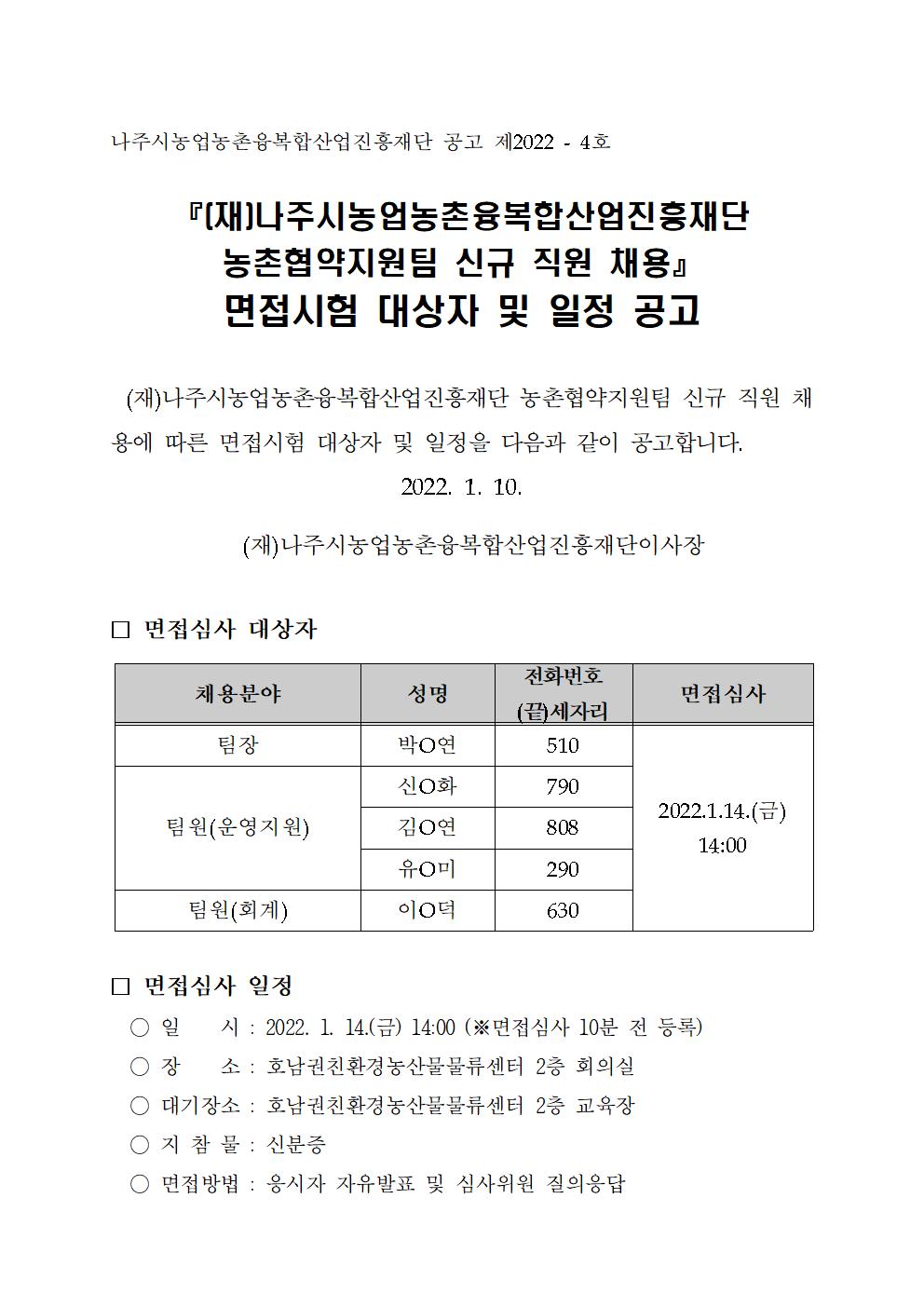 나주농업진흥재단 농촌협약지원팀 신규 직원 채용 면접시험 대상자 및 일정 공고 2022.01.10 10:15 다음글 : 나주농업진흥재단 농민가공팀 신규 직원 채용 공고 이전글 : 나주농업진흥재단 설명절 직매장 판촉행사 진행요원(기간제근로자) 모집 공고