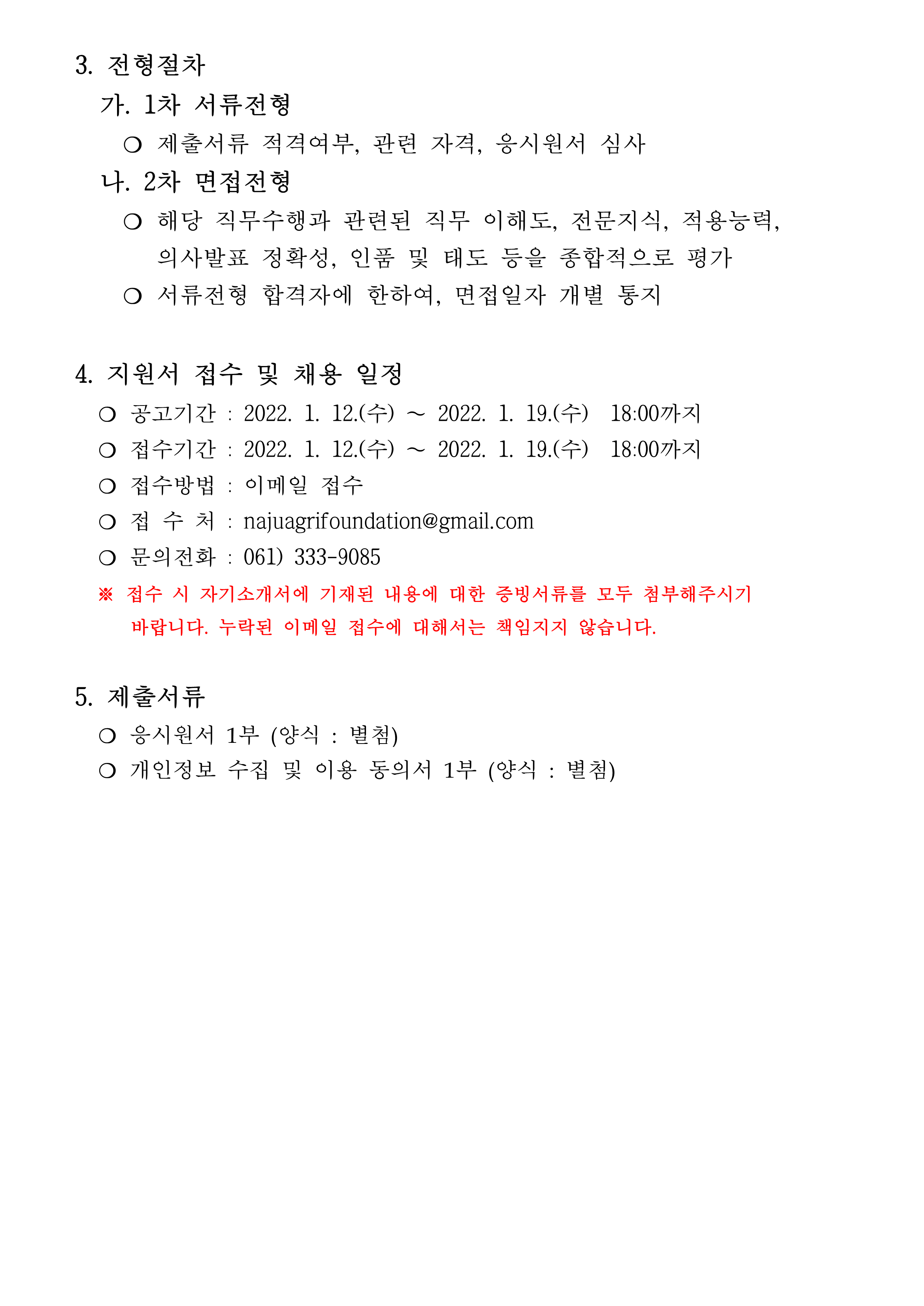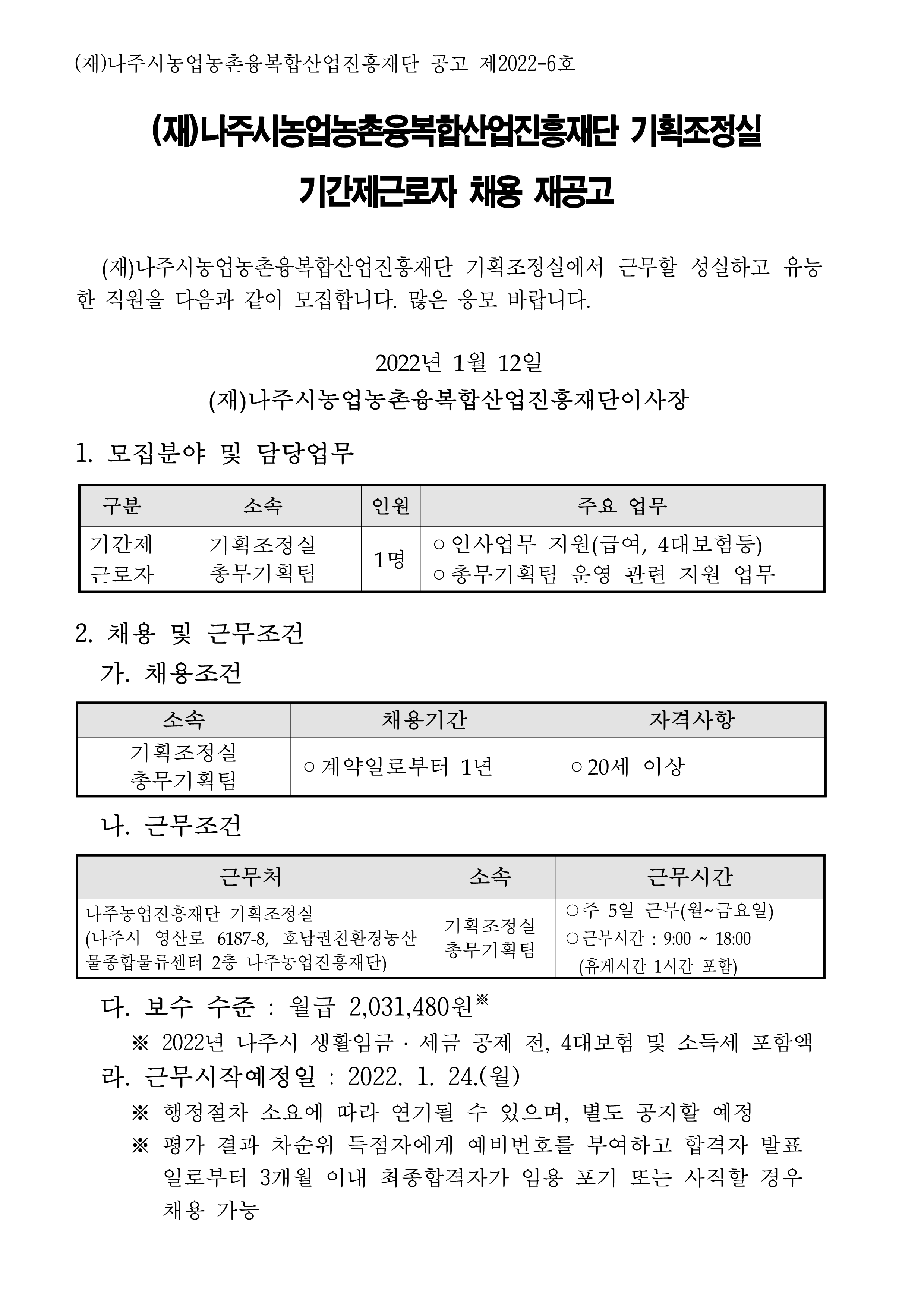 나주농업진흥재단 기획조정실 기간제근로자 채용 재공고 2022.01.12 14:53 File 붙임. 응시원서, 개인정보 이용 동의서.hwp (17 KB) 다음글 : (재)나주시농업농촌융복합산업진흥재단 부이사장 채용 서류심사 합격자 공고 이전글 : 나주농업진흥재단 농민가공팀 신규 직원 채용 공고