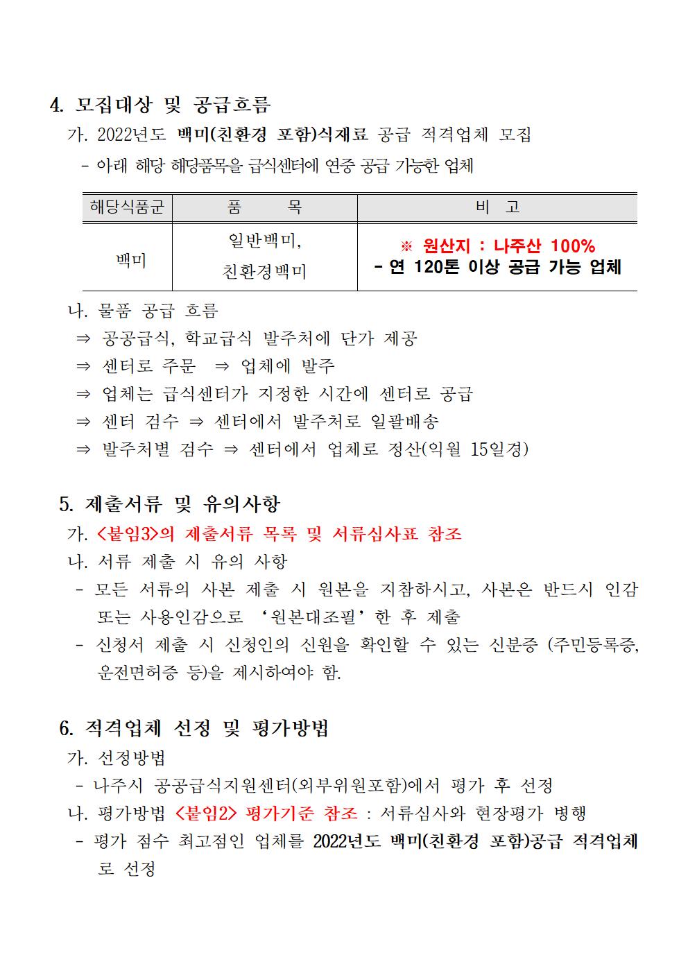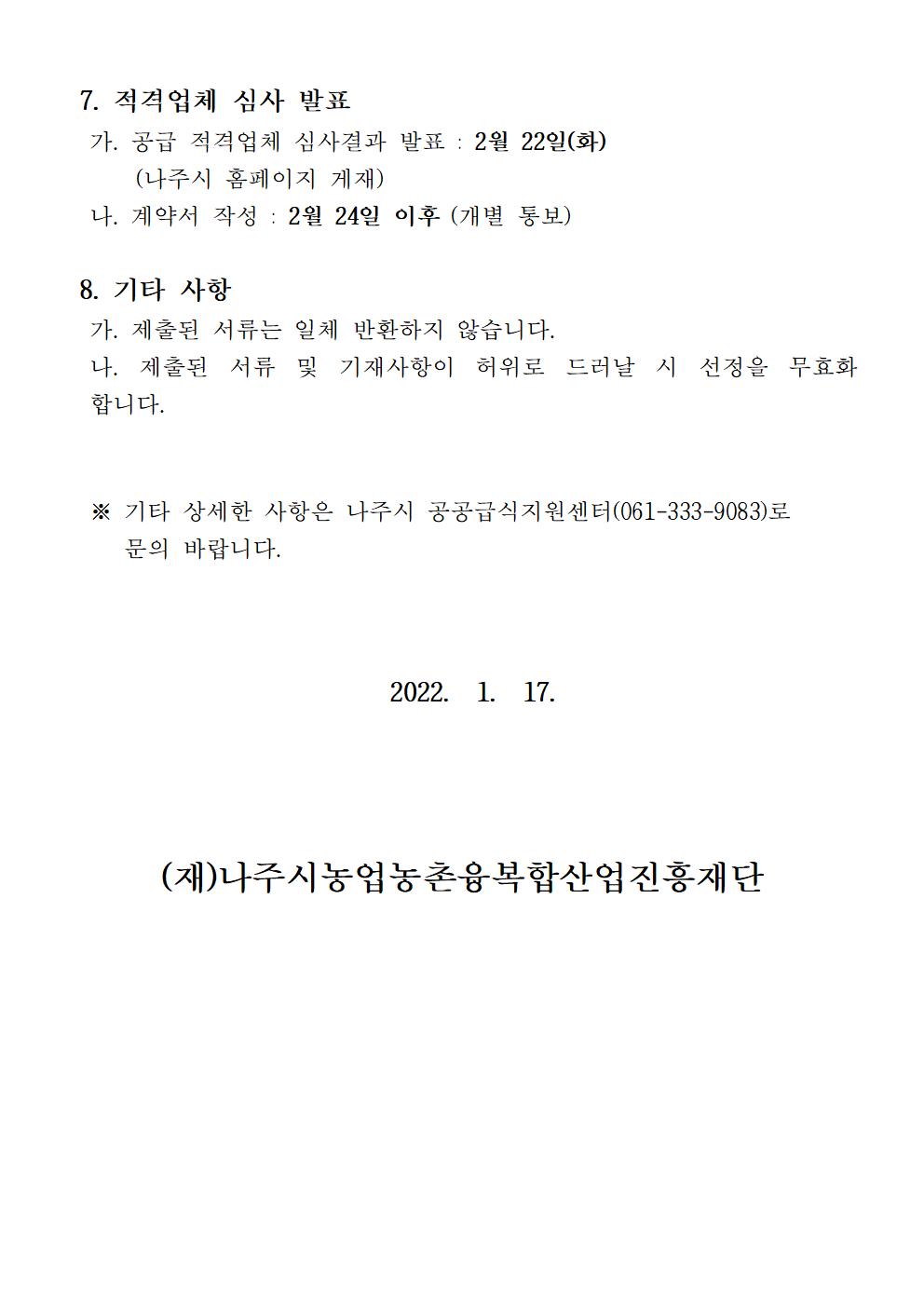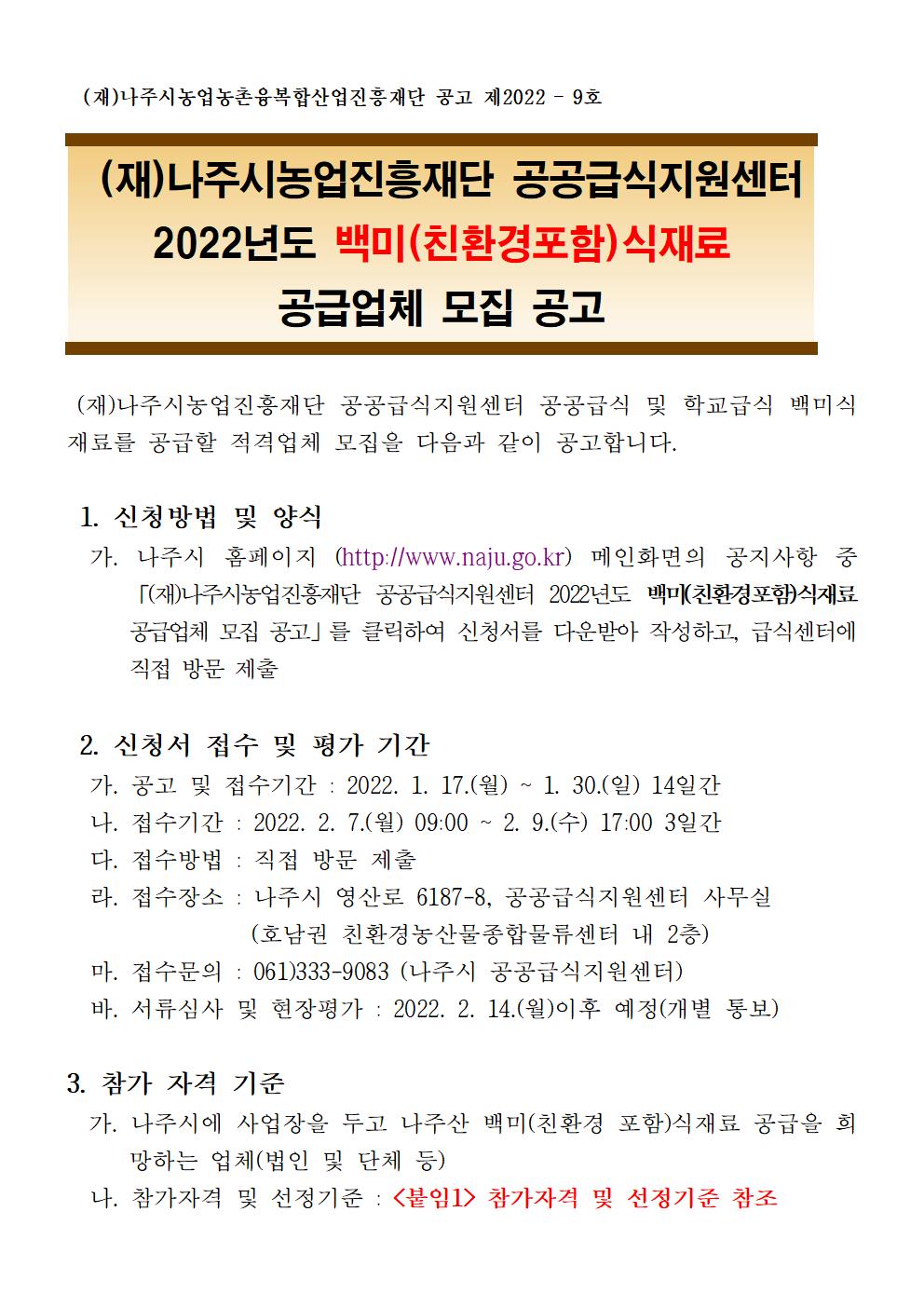 나주농업진흥재단 공공급식지원센터 2022년도 백미(친환경포함) 식재료 공급업체 모집 공고 2022.01.17 09:48 File 붙임문서.hwp (36.5 KB) 다음글 : 나주농업진흥재단 농촌협약지원팀 신규 직원 채용 최종 합격자 공고 이전글 : (재)나주시농업농촌융복합산업진흥재단 부이사장 채용 서류심사 합격자 공고
