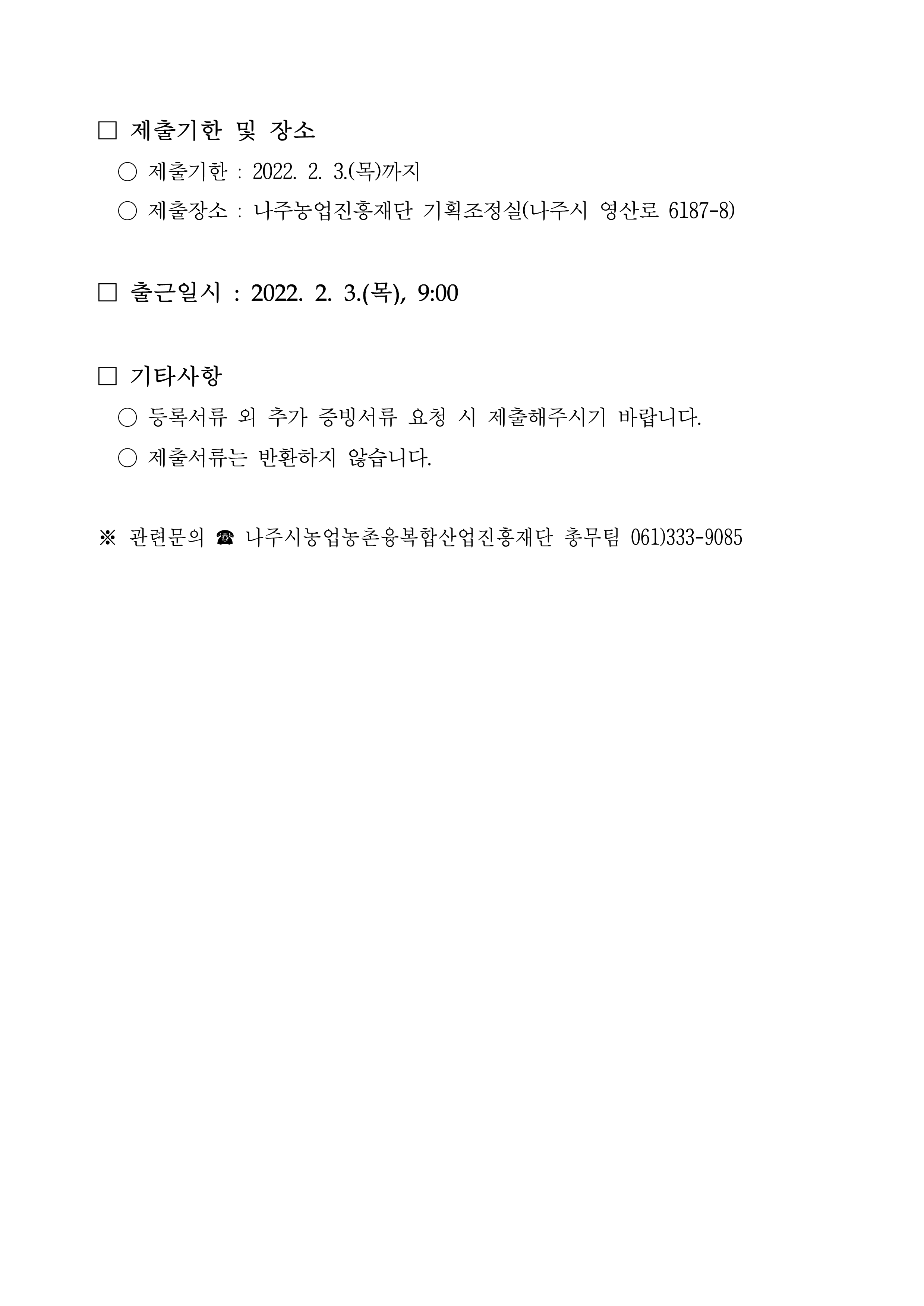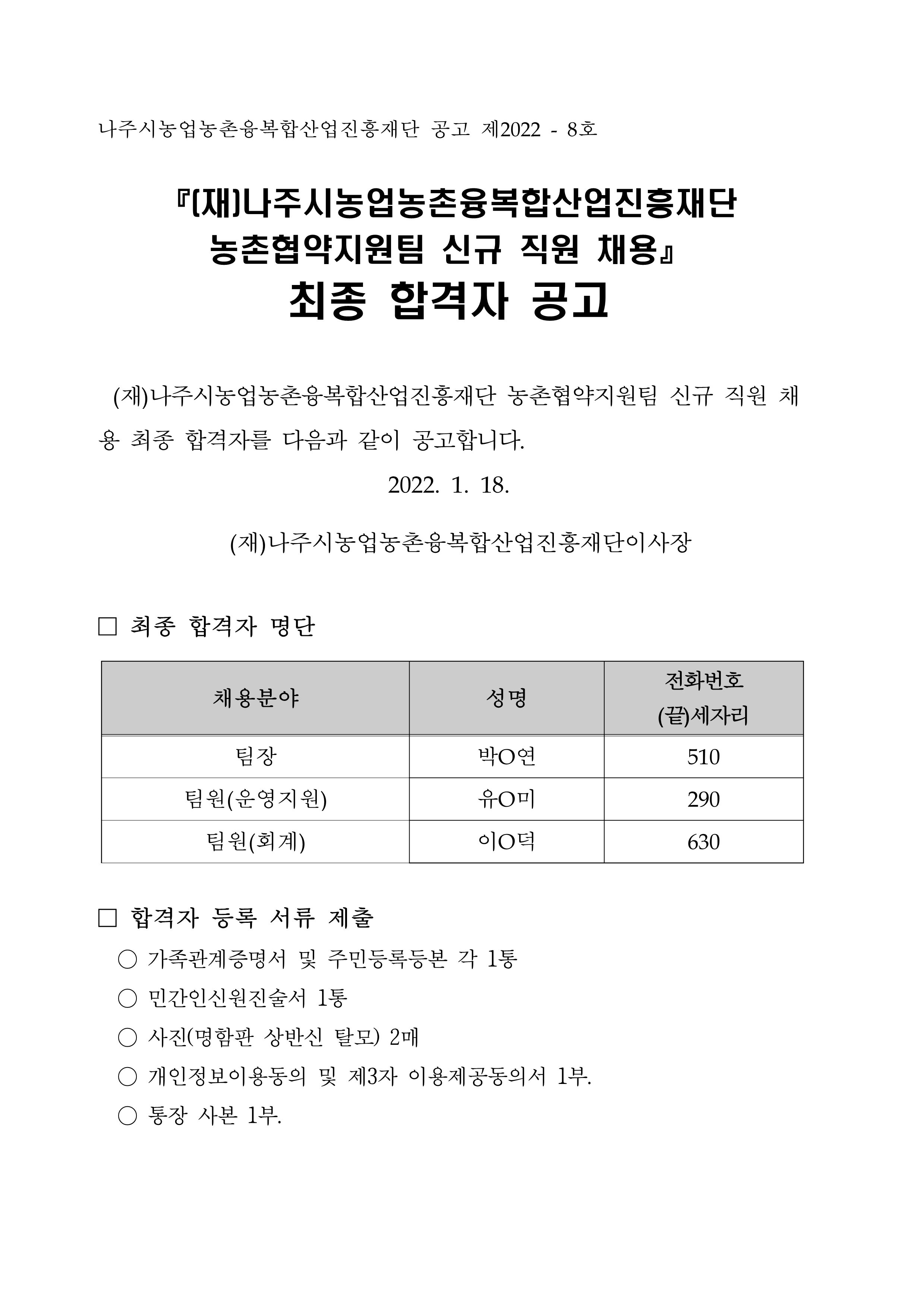 나주농업진흥재단 농촌협약지원팀 신규 직원 채용 최종 합격자 공고 2022.01.18 10:13 File 민간인신원진술서,_개인정보수집및이용동의서_양식.hwp (19 KB) 다음글 : 나주농업진흥재단 회계팀, 금나와락 기간제근로자 채용 공고 이전글 : 나주농업진흥재단 공공급식지원센터 2022년도 백미(친환경포함) 식재료 공급업체 모집 공고