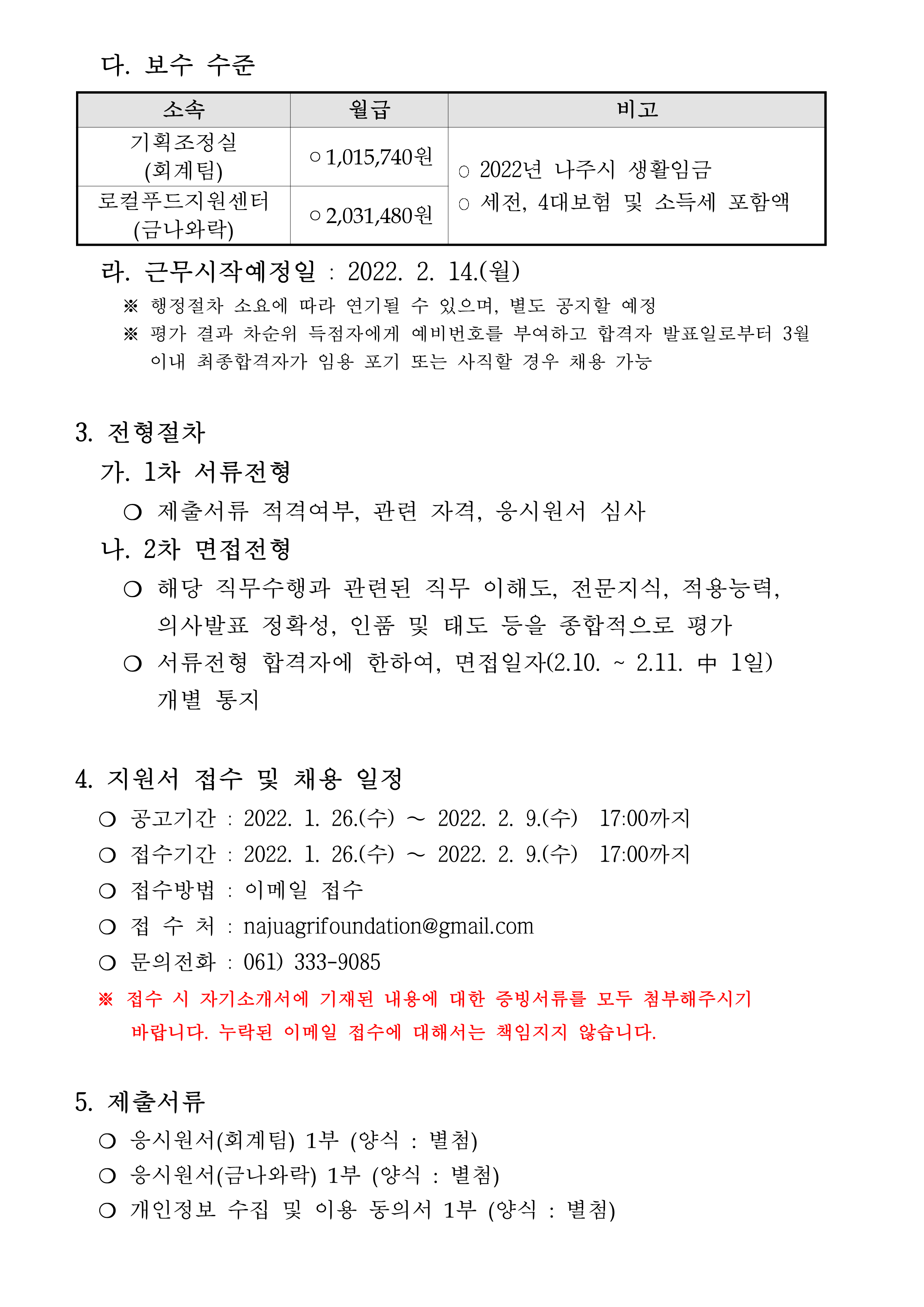 나주농업진흥재단 회계팀, 금나와락 기간제근로자 채용 공고 2022.01.26 11:21 File 회계팀 채용(응시원서).hwp (17 KB) 금나와락 채용(응시원서).hwp (17 KB) 다음글 : 나주농업진흥재단 농민가공팀 신규 직원 채용 인적성 검사·면접시험 대상자 및 일정 공고 이전글 : 나주농업진흥재단 농촌협약지원팀 신규 직원 채용 최종 합격자 공고