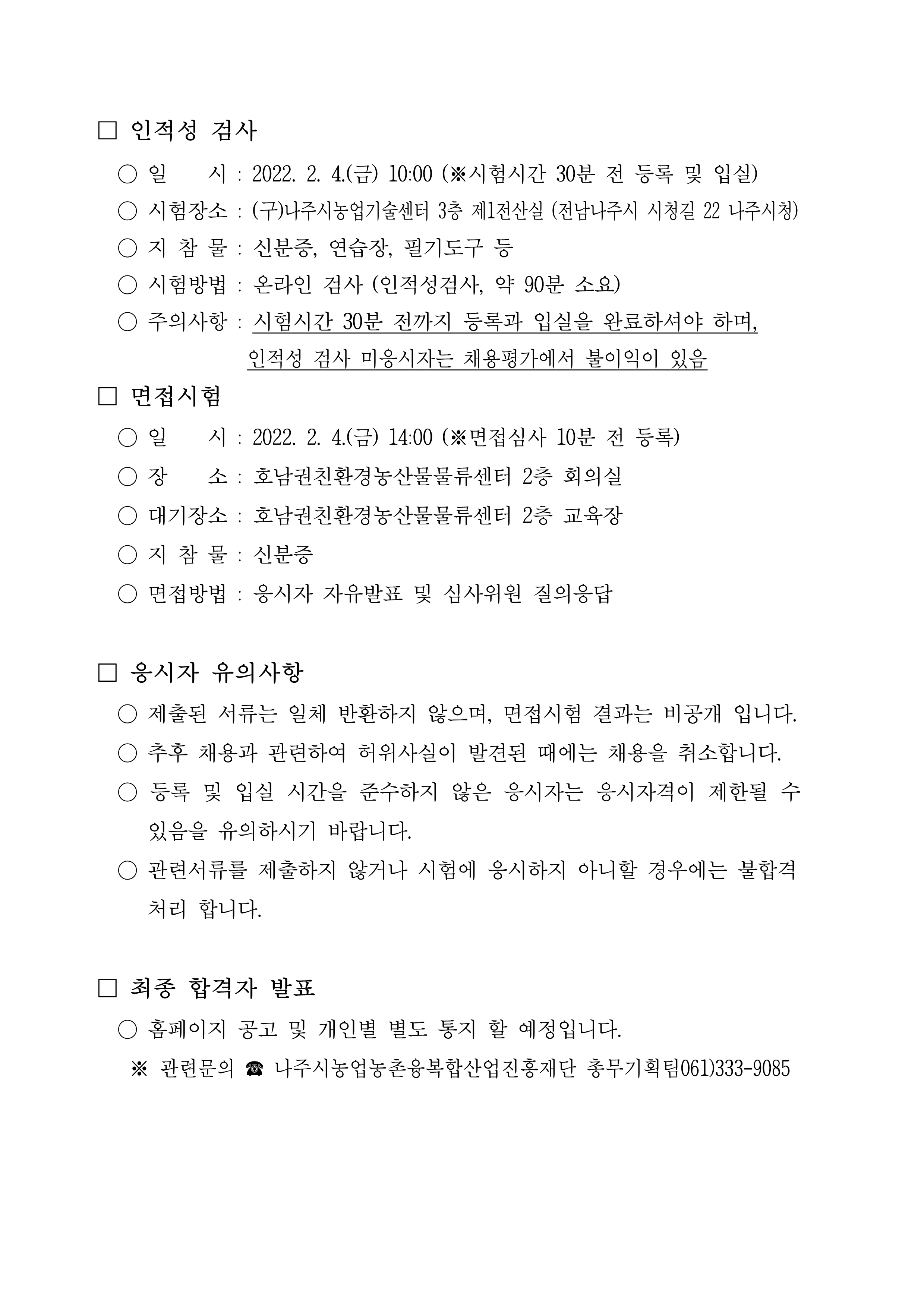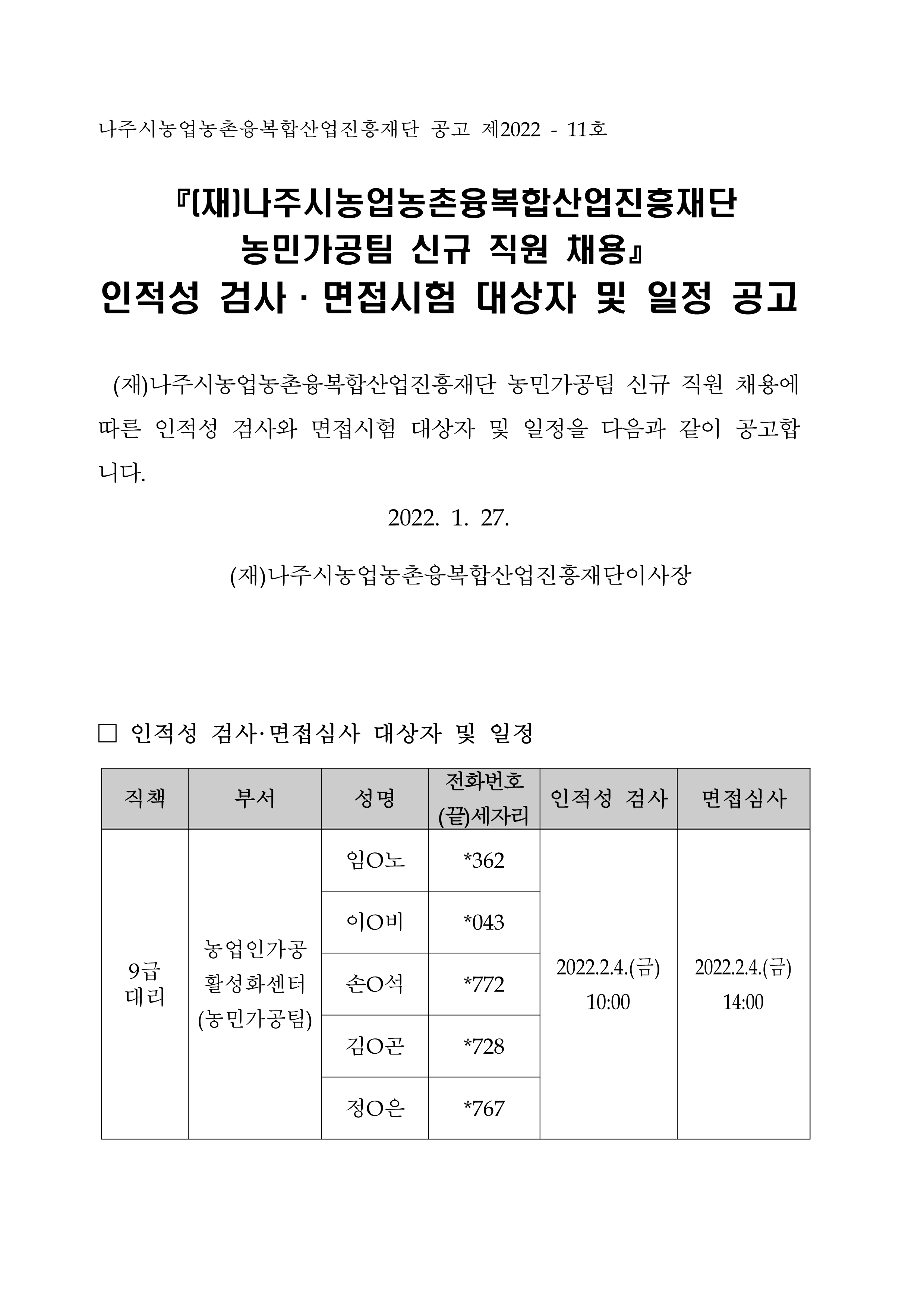 나주농업진흥재단 농민가공팀 신규 직원 채용 인적성 검사·면접시험 대상자 및 일정 공고 2022.01.27 14:03 다음글 : 2022 천연색소 경쟁력강화 지원사업 시행지침 알림 이전글 : 나주농업진흥재단 회계팀, 금나와락 기간제근로자 채용 공고