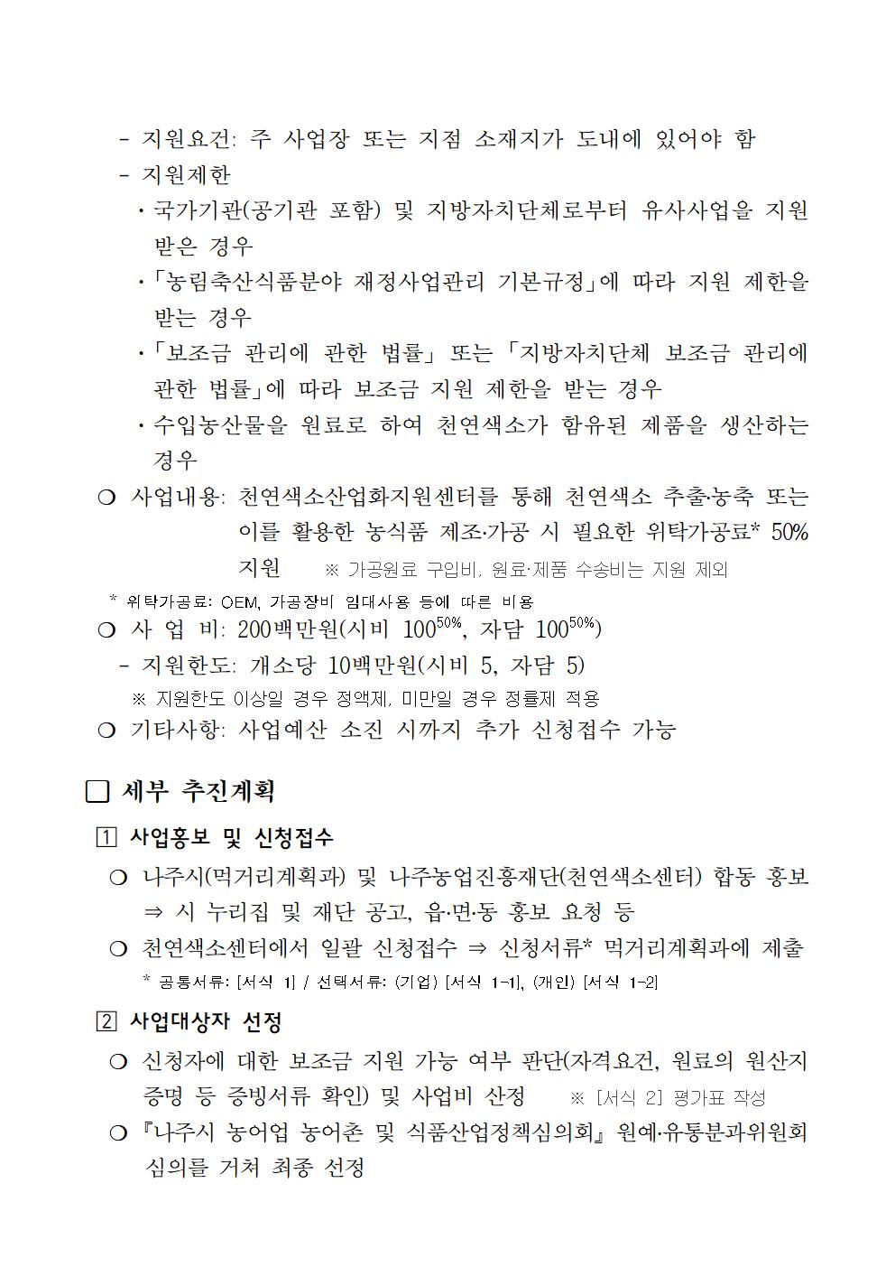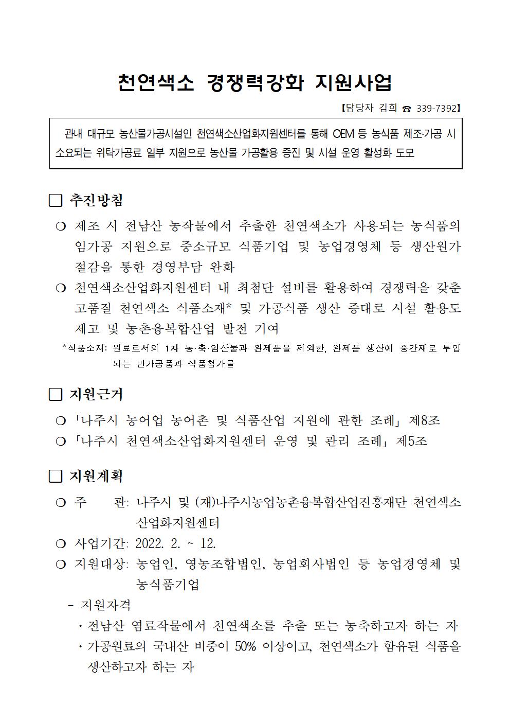 2022 천연색소 경쟁력강화 지원사업 시행지침 알림 2022.02.07 10:41 File 첨부서류.hwp (34.5 KB) 다음글 : (재)나주시농업농촌융복합산업진흥재단 부이사장 채용 최종 합격자 공고 이전글 : 나주농업진흥재단 농민가공팀 신규 직원 채용 인적성 검사·면접시험 대상자 및 일정 공고
