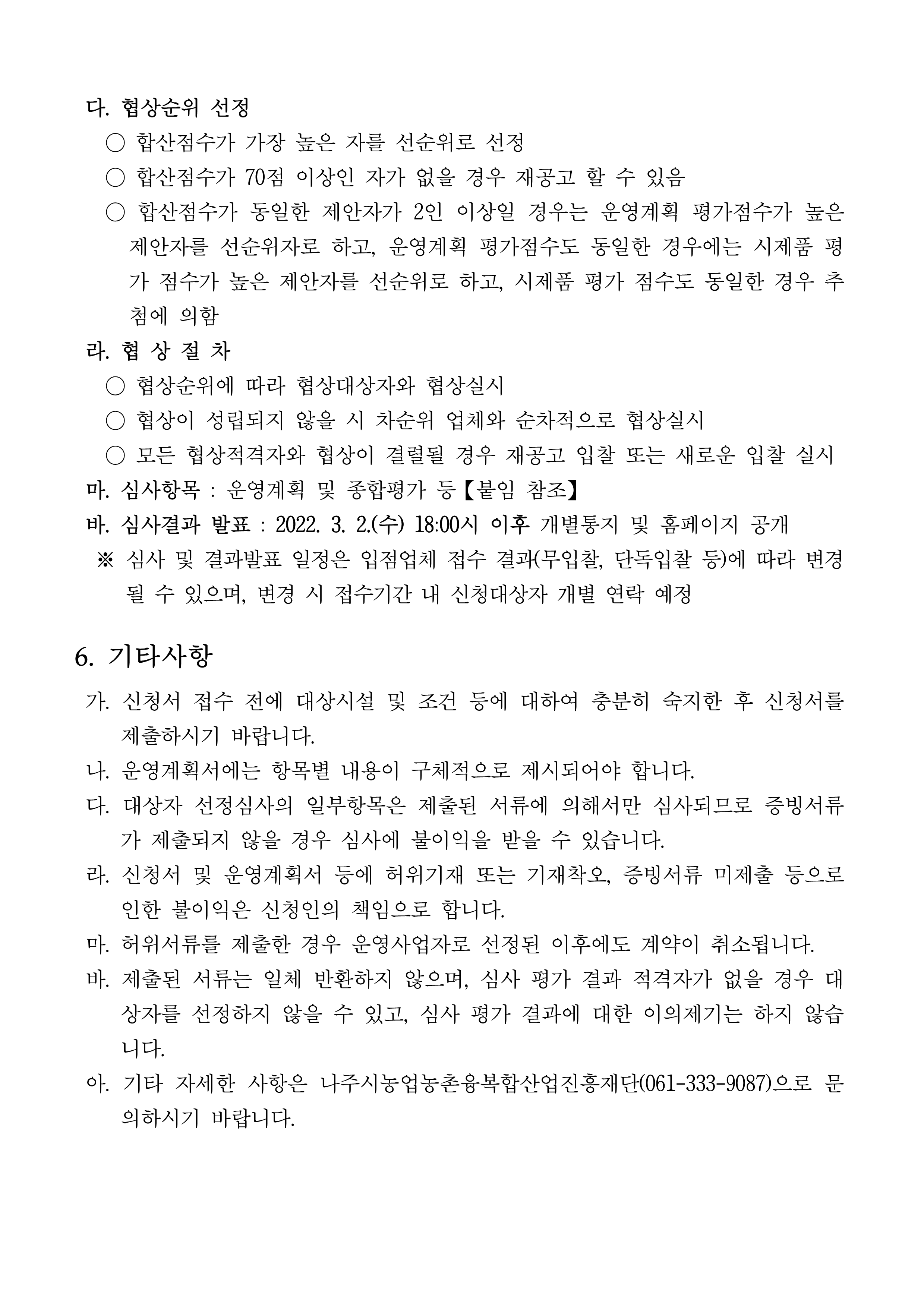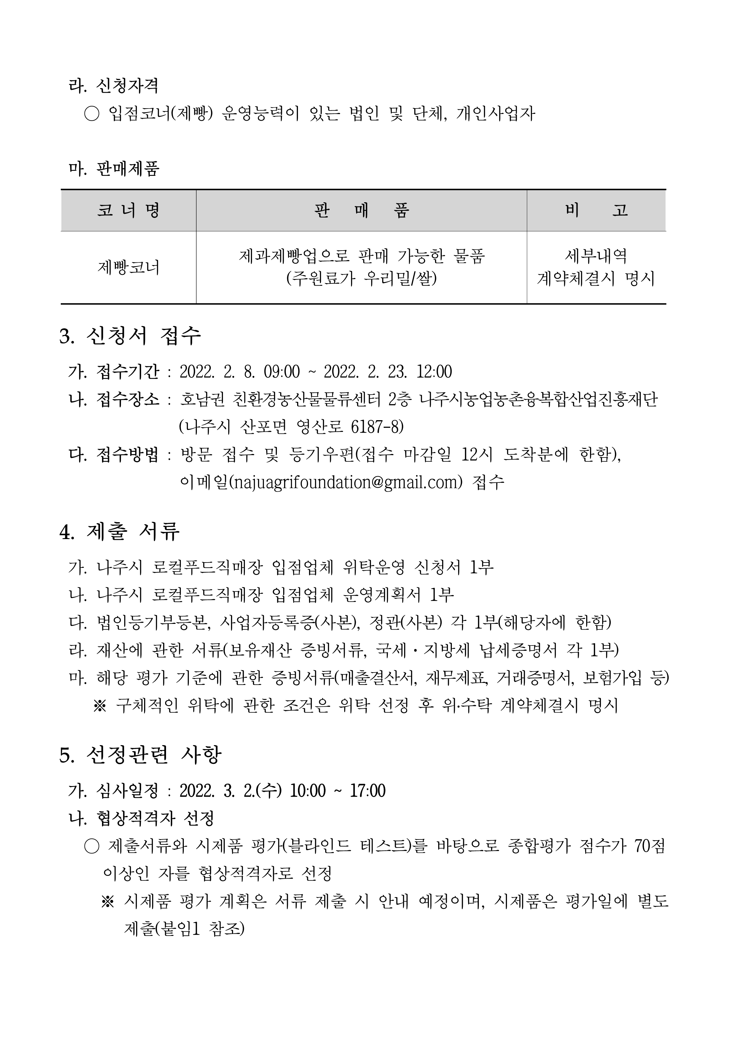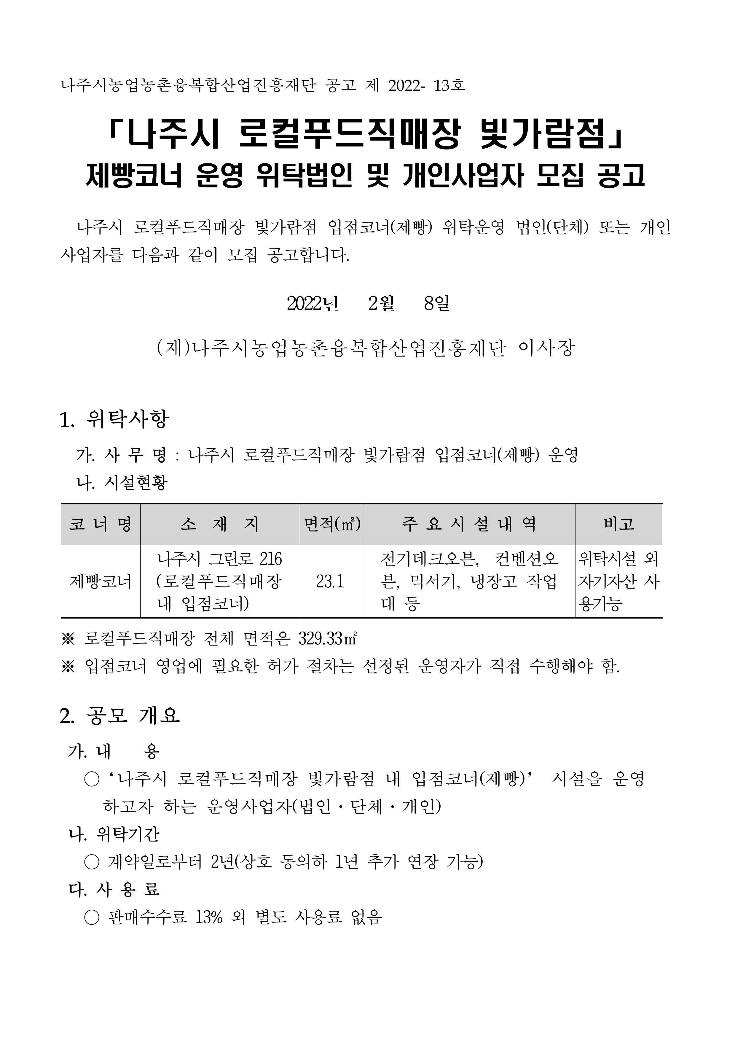 나주시 로컬푸드직매장 빛가람점 제빵코너 운영 위탁법인 및 개인사업자 모집 공고 2022.02.08 09:20 File 붙임1. 입점코너 위탁운영 신청서 및 운영계획서.hwp (19.5 KB) 붙임2. 입점코너 심사 평가표.hwp (21 KB) 다음글 : 나주농업진흥재단 농민가공팀 신규 직원 채용 최종 합격자 공고 이전글 : (재)나주시농업농촌융복합산업진흥재단 부이사장 채용 최종 합격자 공고