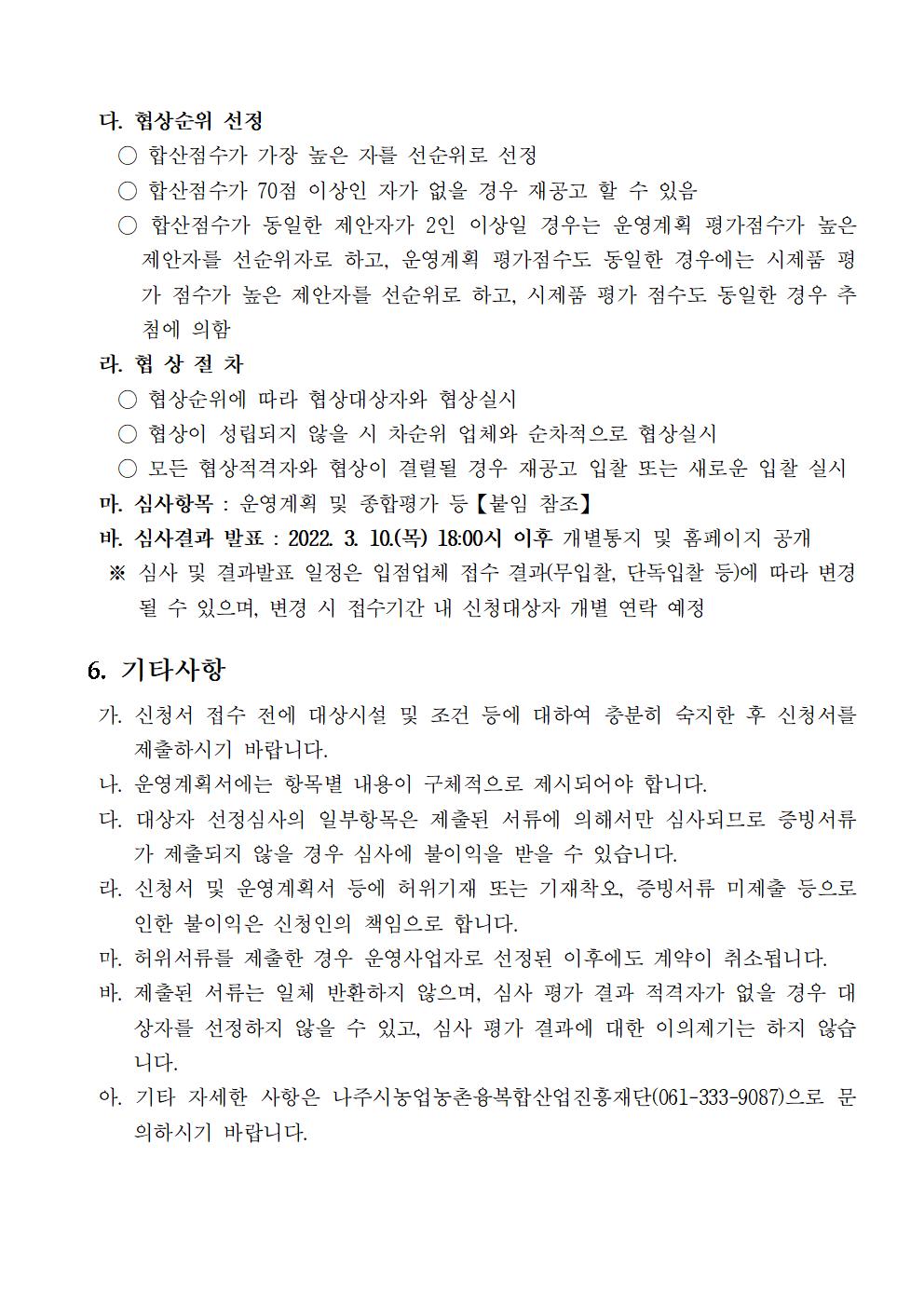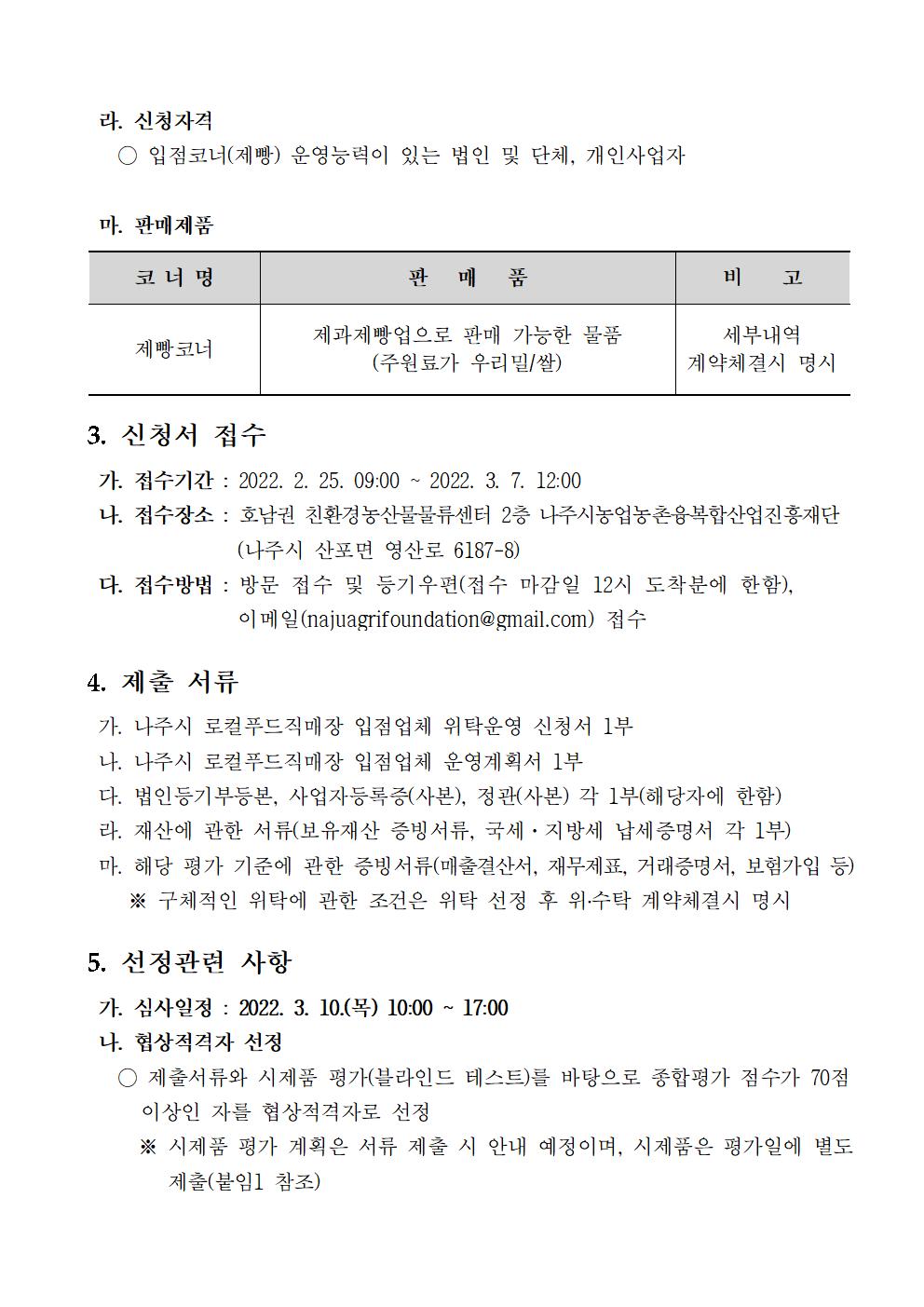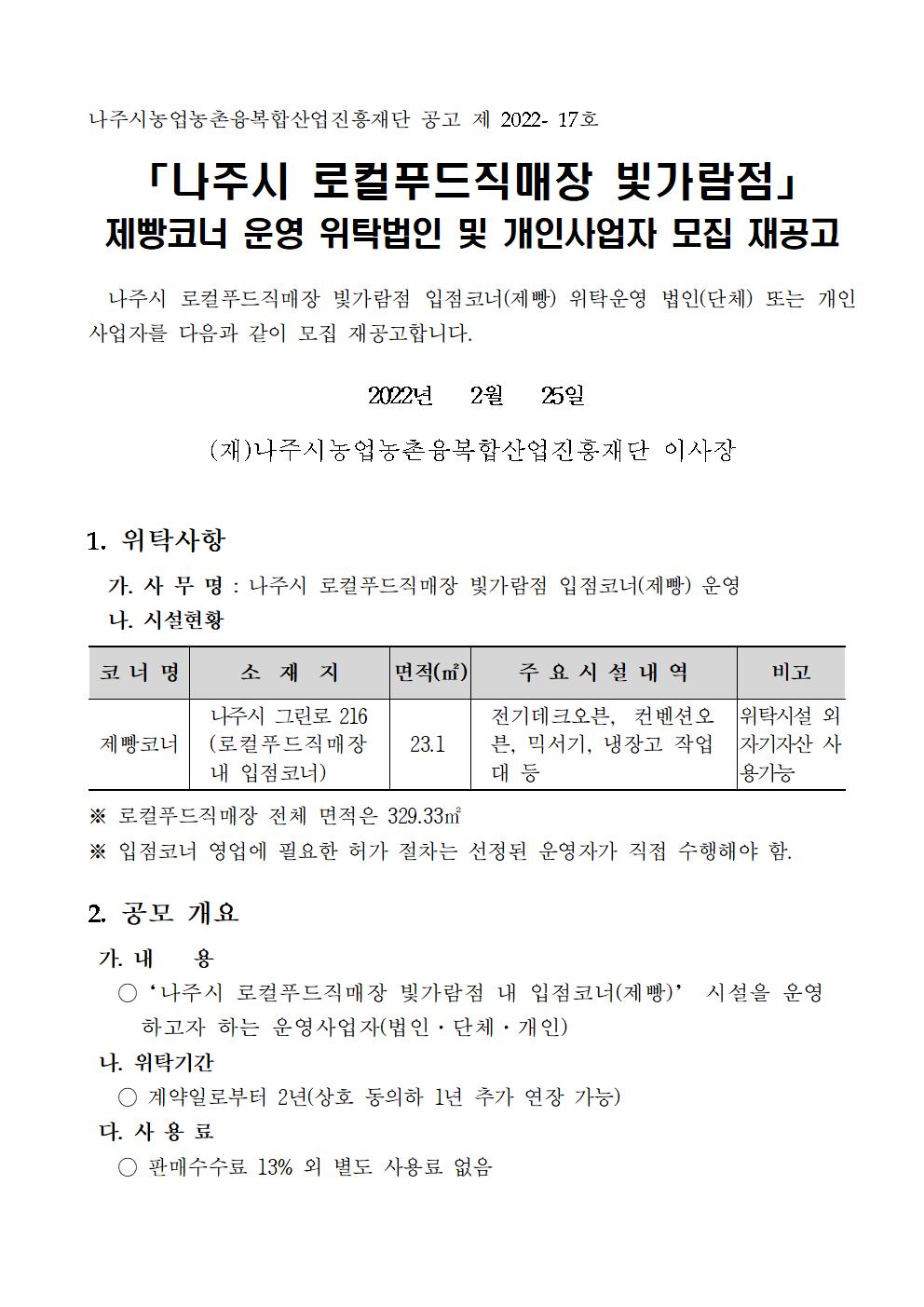 「나주시 로컬푸드직매장 빛가람점」 제빵코너 운영 위탁법인 및 개인사업자 모집 재공고 2022.02.24 18:45 File 붙임 1 운영신청서 및 계획서.hwp (67 KB) 붙임 2 심사평가표.hwp (104 KB) 다음글 : 나주시 로컬푸드직매장 빛가람점 제빵코너 위탁운영자 선정 결과 알림 이전글 : 나주시농업진흥재단 공공급식지원센터 2022년도 백미(친환경포함) 식재료 공급업체 모집 재공고