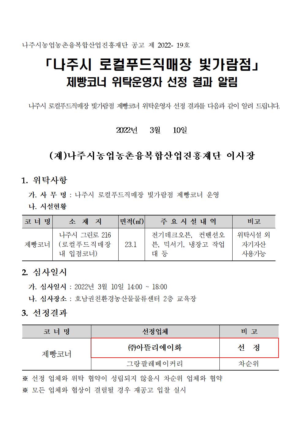 나주시 로컬푸드직매장 빛가람점 제빵코너 위탁운영자 선정 결과 알림 2022.03.10 19:22 다음글 : (재)나주시농업농촌융복합산업진흥재단 공공급식지원센터 직원 채용 공고 이전글 : 「나주시 로컬푸드직매장 빛가람점」 제빵코너 운영 위탁법인 및 개인사업자 모집 재공고