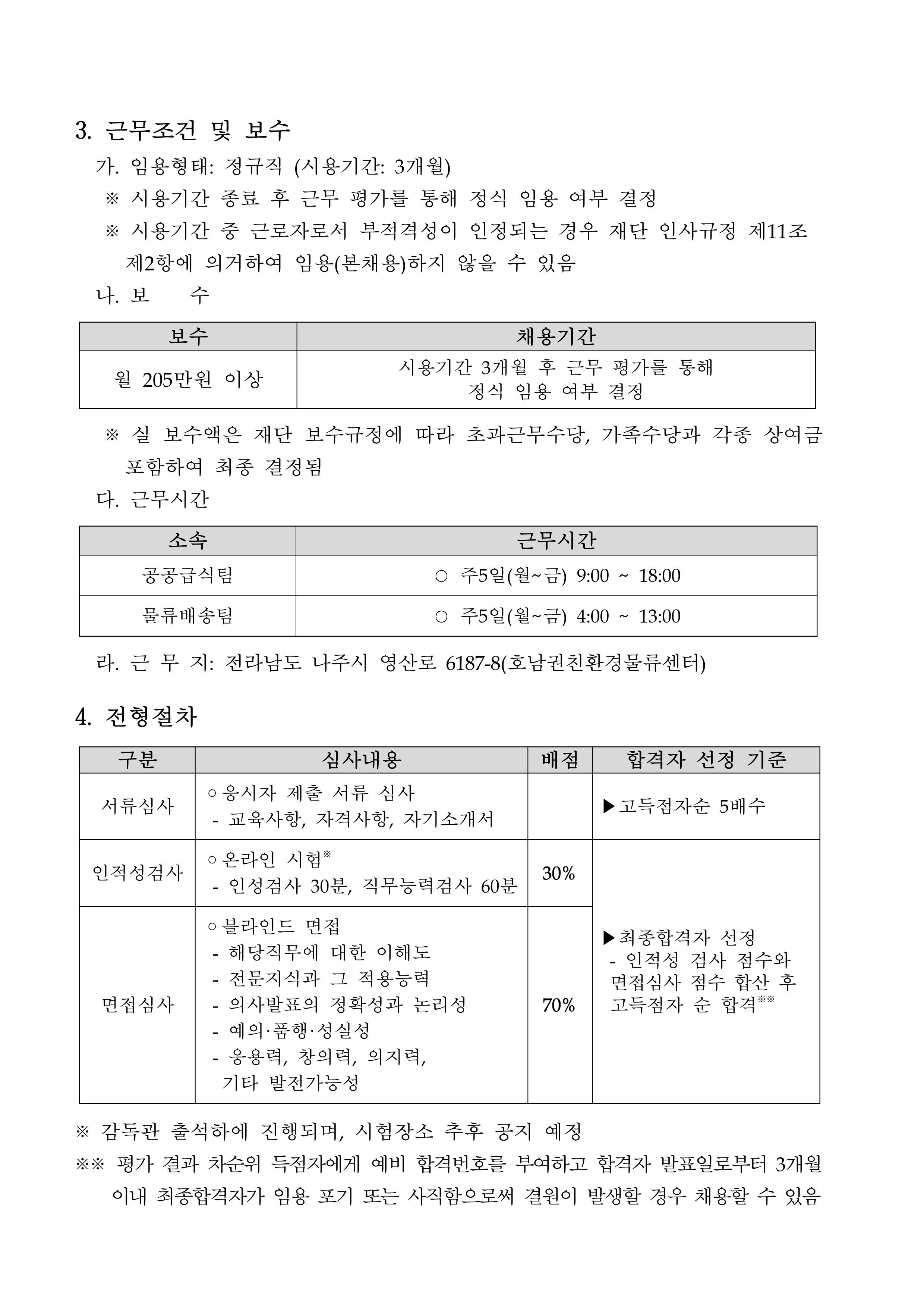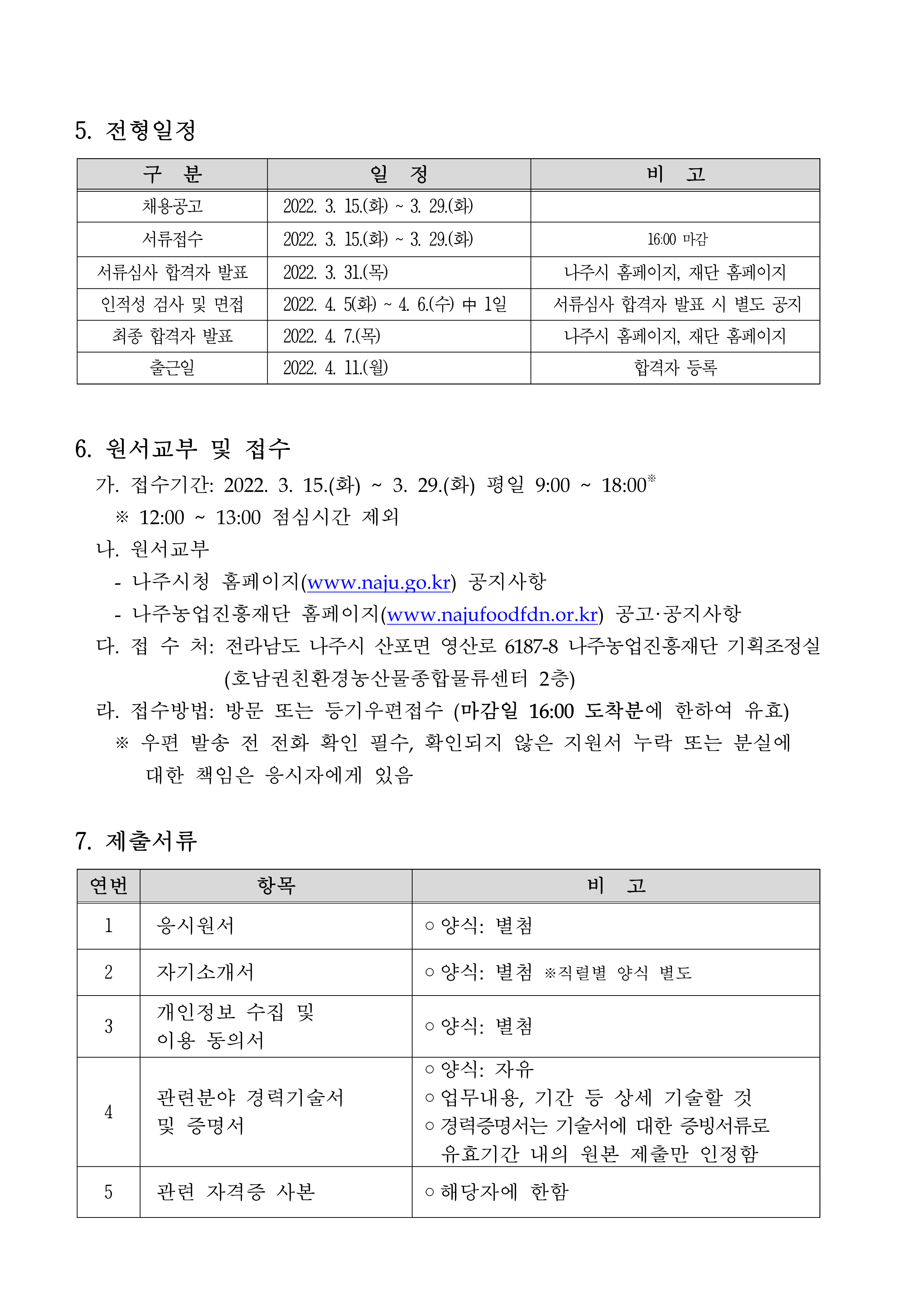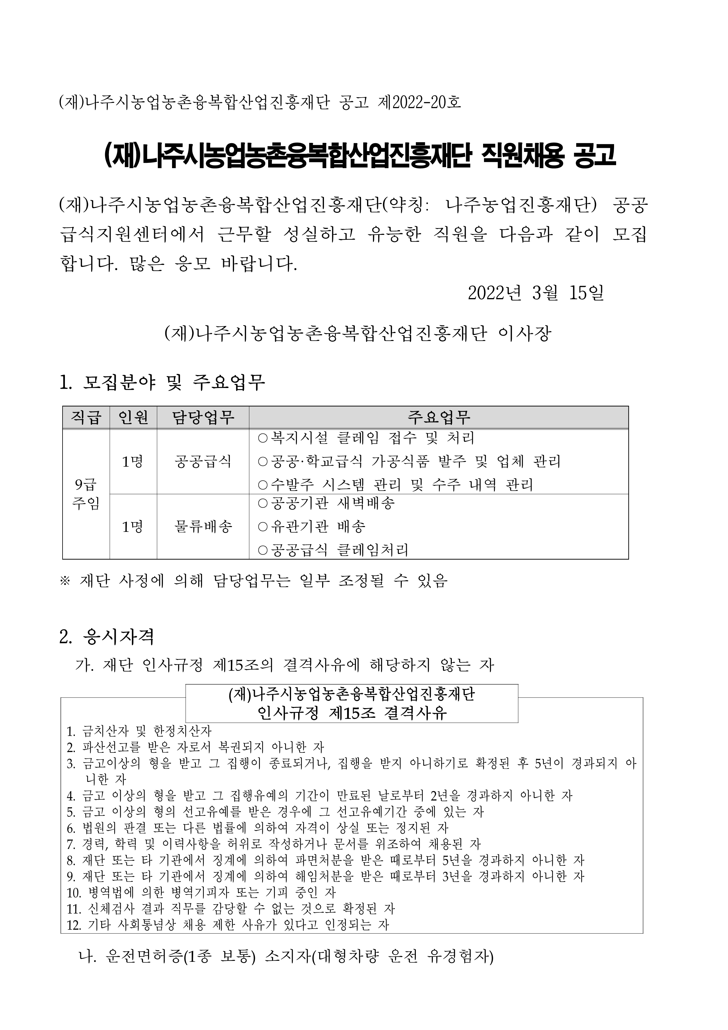 (재)나주시농업농촌융복합산업진흥재단 공공급식지원센터 직원 채용 공고 2022.03.15 14:01 File 붙임1. 자기소개서(공공급식팀).hwp (14 KB) 붙임2. 자기소개서(물류배송팀).hwp (14 KB) 붙임3. 응시원서 및 개인정보수집 및 이용동의서(공통양식).hwp (17 KB) 다음글 : 「나주시 로컬푸드직매장 빛가람점」 입점코너(축산) 운영 위탁법인 및 개인사업자 모집 공고 이전글 : 나주시 로컬푸드직매장 빛가람점 제빵코너 위탁운영자 선정 결과 알림