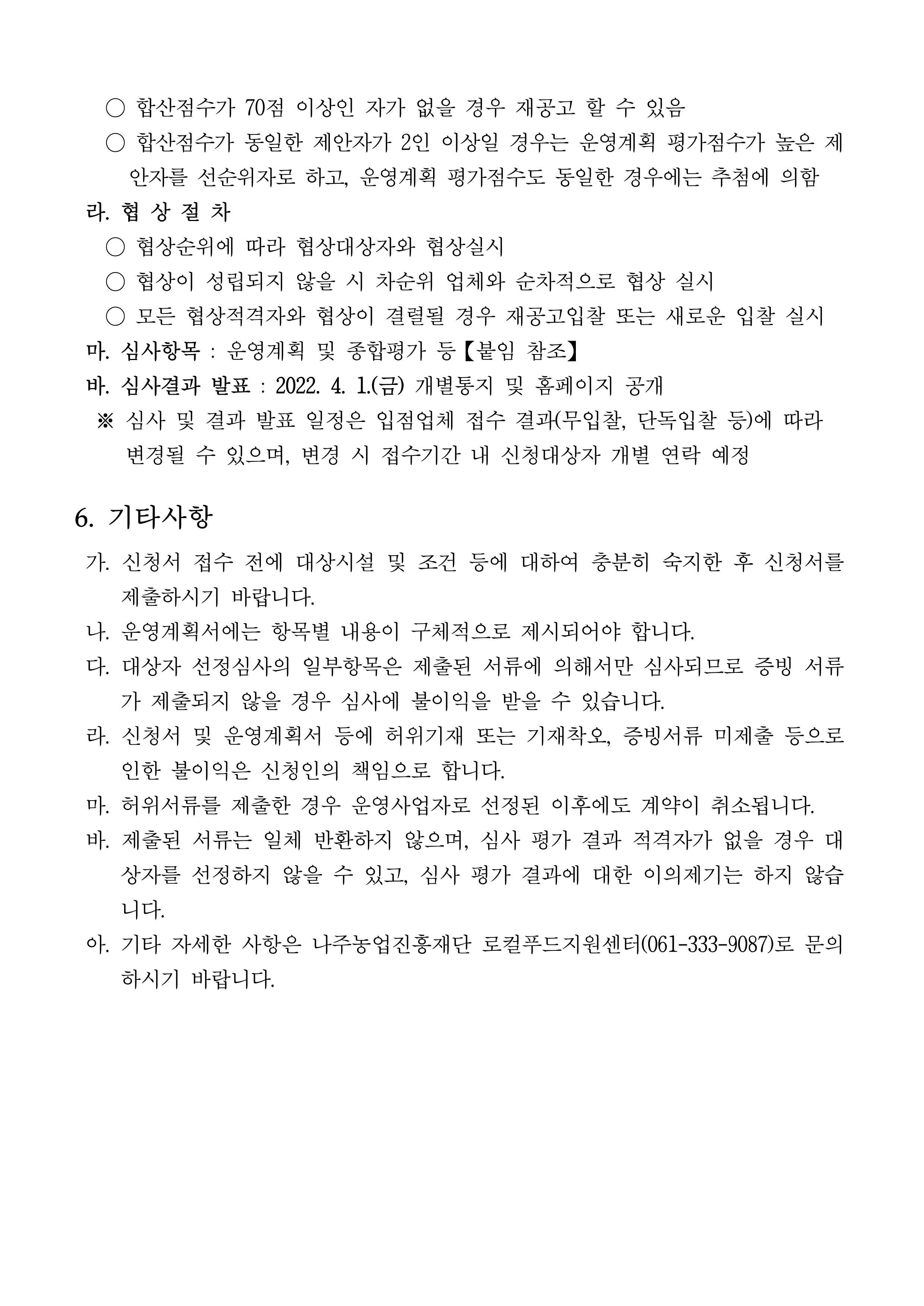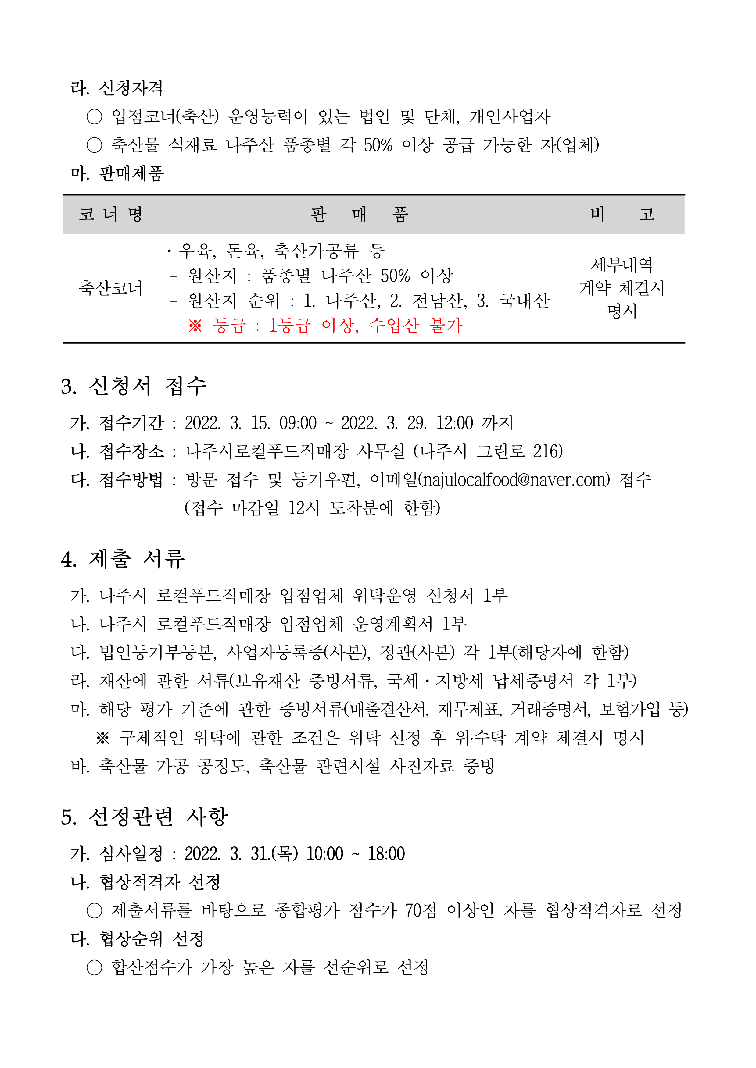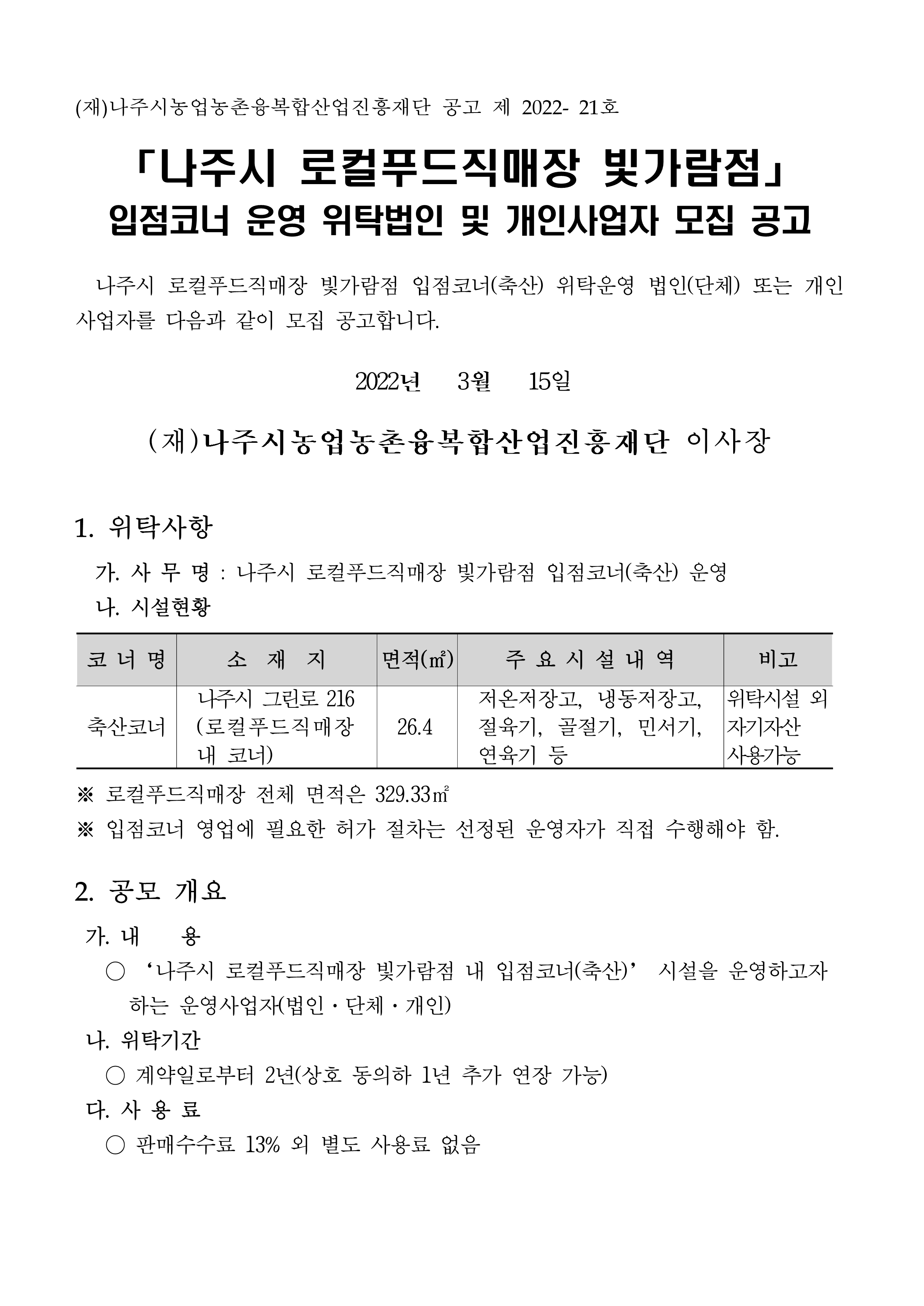 「나주시 로컬푸드직매장 빛가람점」 입점코너(축산) 운영 위탁법인 및 개인사업자 모집 공고 2022.03.15 14:13 File 붙임1. 입점코너 심사 평가표(축산).hwp (20.5 KB) 붙임2. 입점코너 위탁운영 신청서 및 운영 계획서.hwp (19.5 KB) 다음글 : 나주농업진흥재단 공공급식지원센터 2022년도 백미(친환경포함) 식재료 공급업체 모집 결과 공고 이전글 : (재)나주시농업농촌융복합산업진흥재단 공공급식지원센터 직원 채용 공고