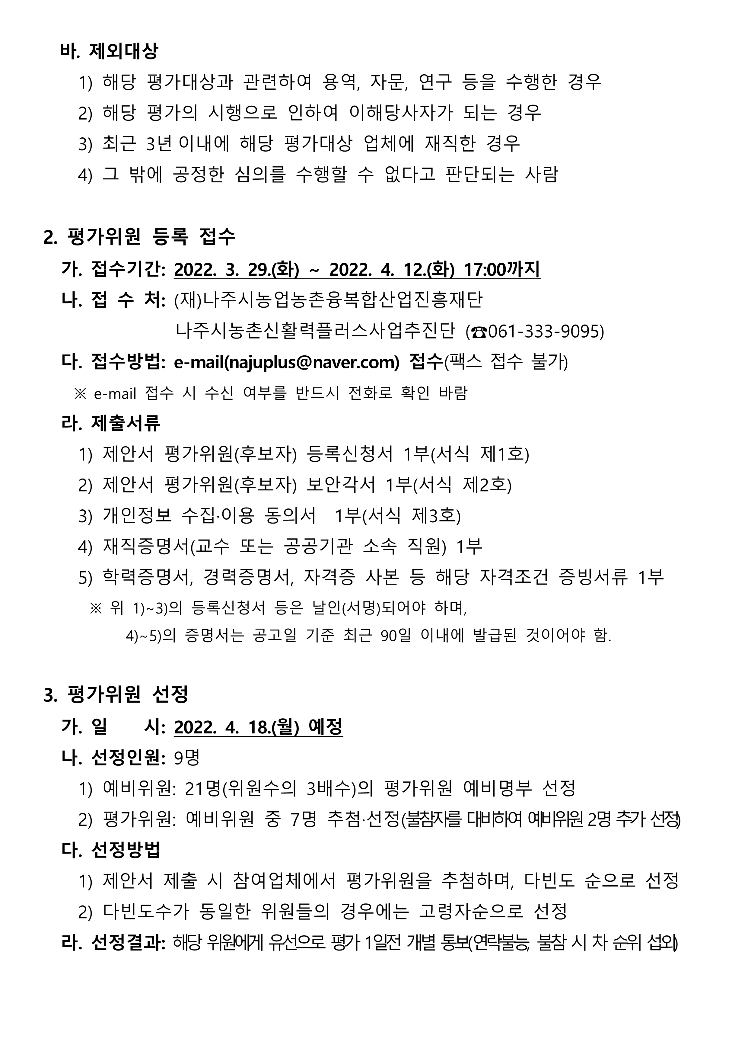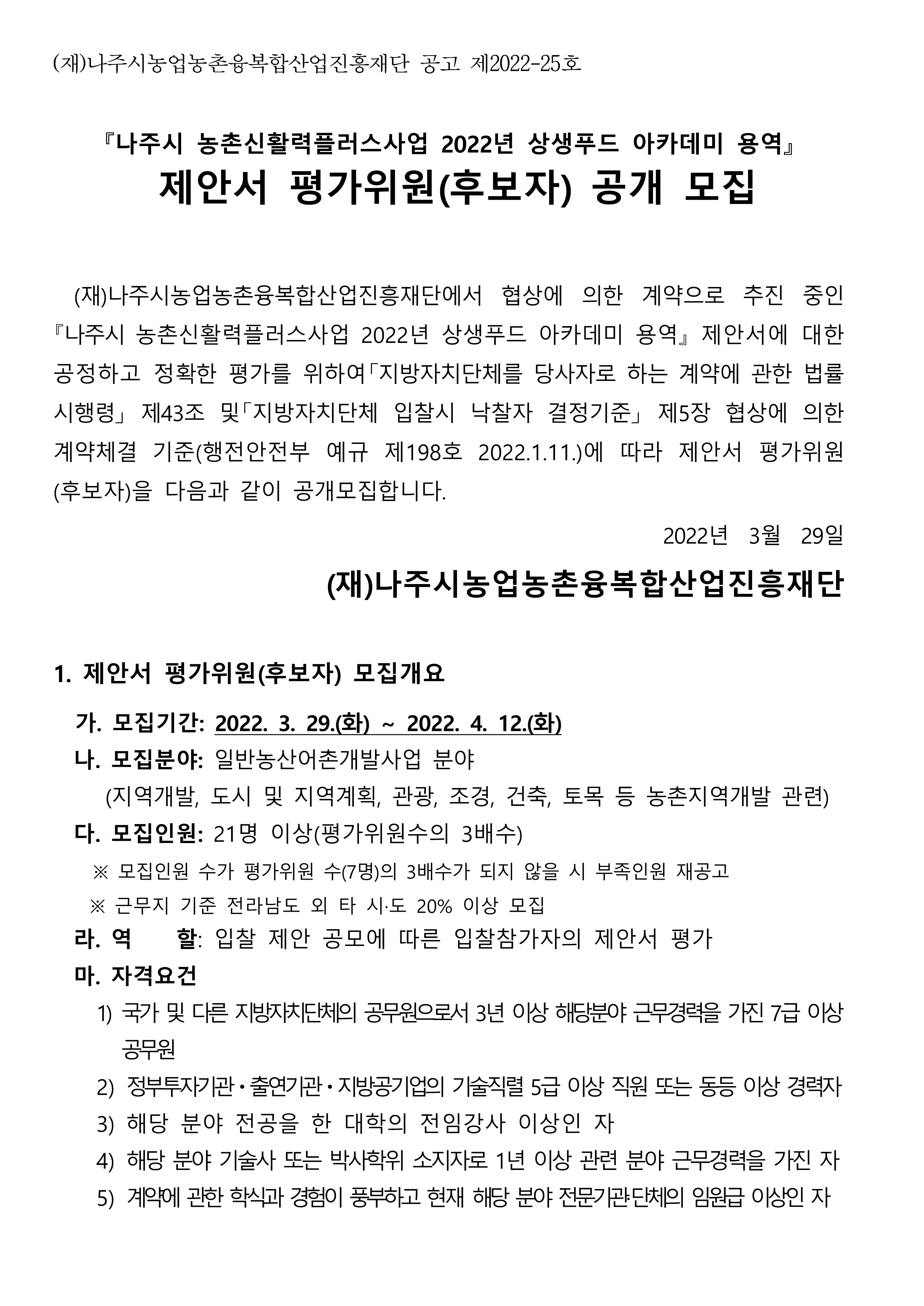 「나주시 농촌신활력플러스사업 2022년 상생푸드 아카데미 용역」 제안서 평가위원(후보자) 공개 모집