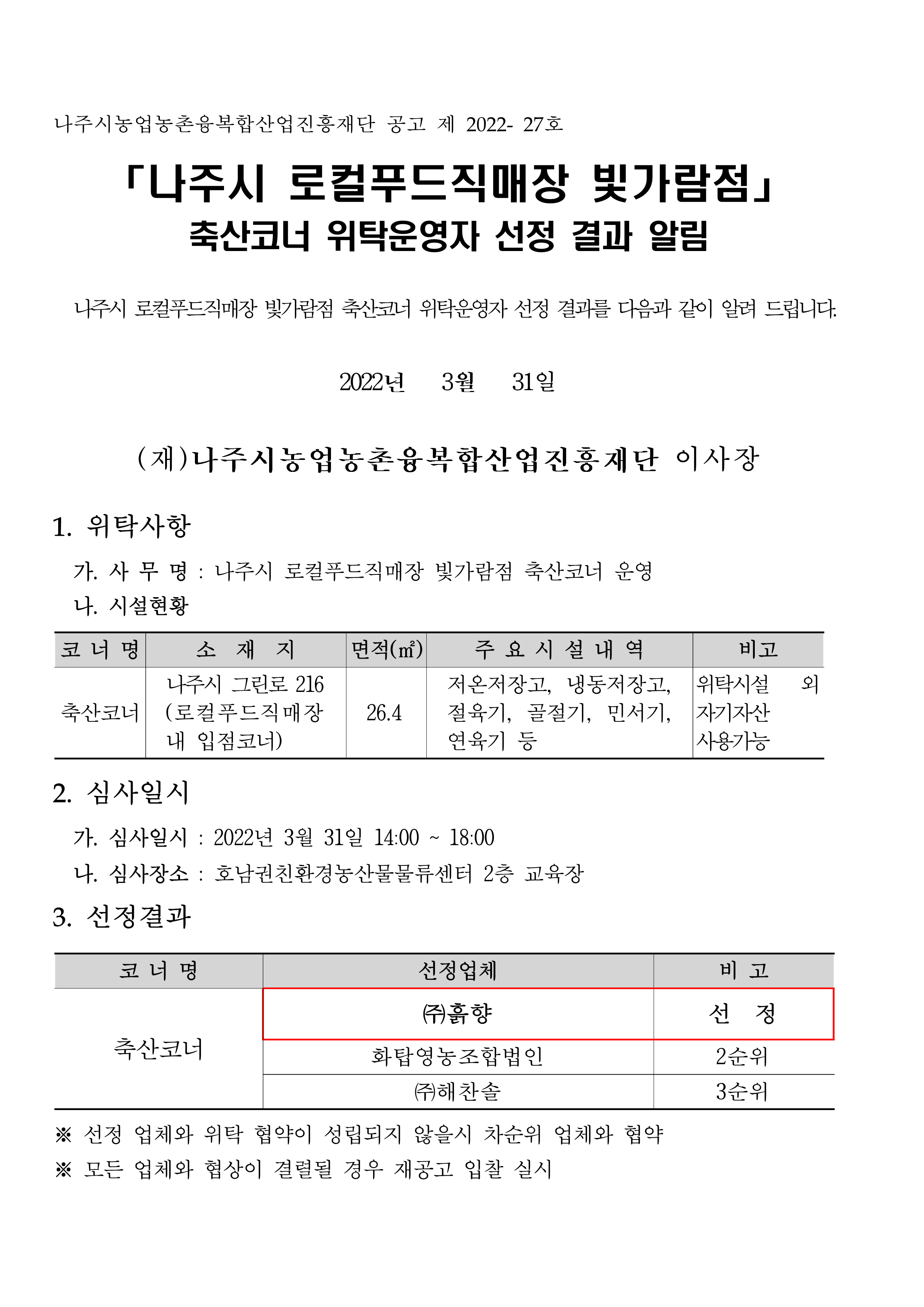 「나주시 로컬푸드직매장 빛가람점」 축산코너 위탁운영자 선정 결과 알림 2022.03.31 17:57 다음글 : 『(재)나주시농업농촌융복합산업진흥재단 공공급식지원센터 직원 채용』 최종 합격자 공고 이전글 : 「(재)나주시농업농촌융복합산업진흥재단 공공급식지원센터 신규 직원 채용」 인적성 검사·면접시험 대상자 및 일정 공고