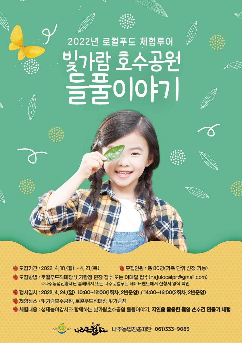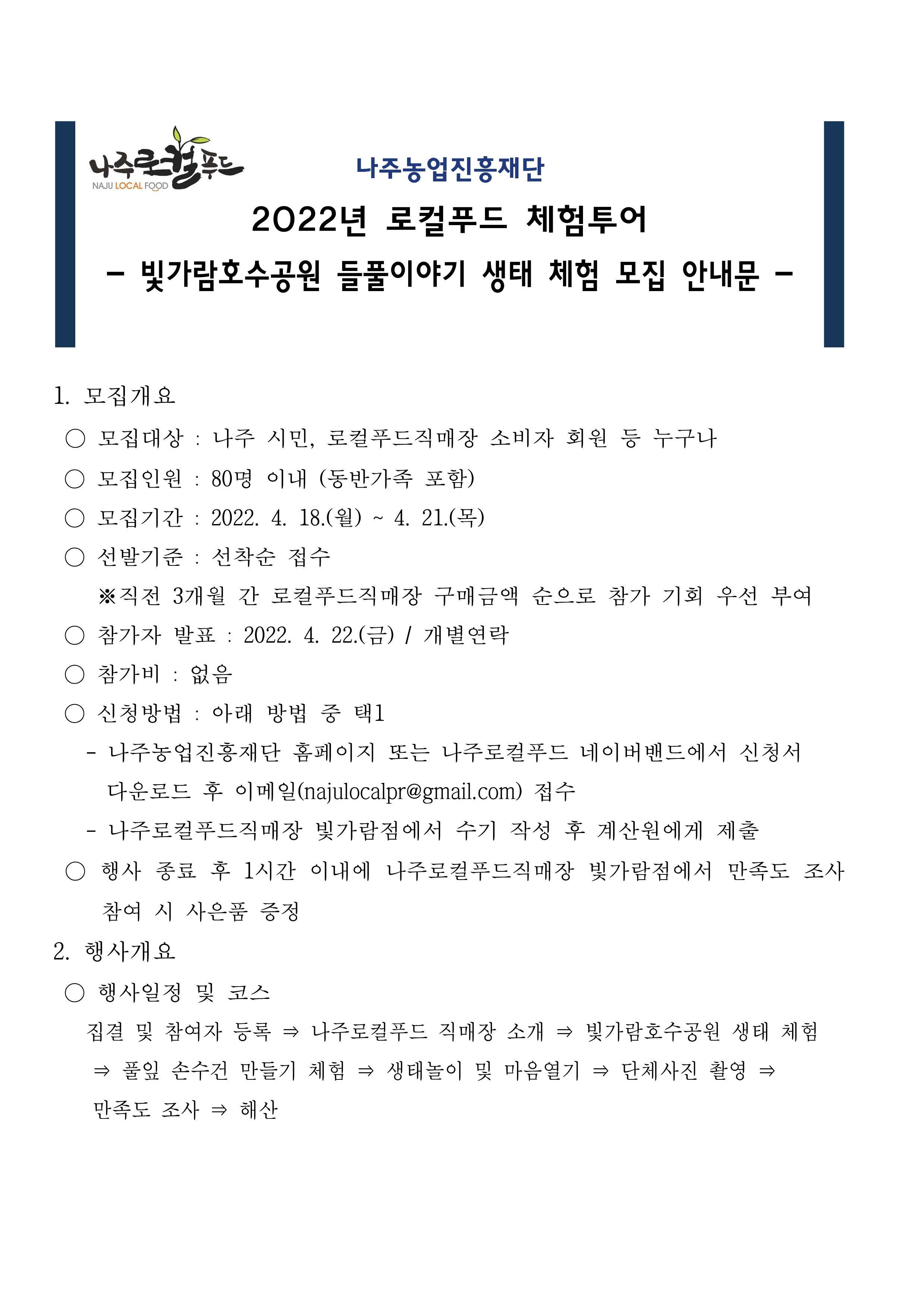 2022년 로컬푸드 체험투어 빛가람 호수공원 생태놀이 참가자 모집
