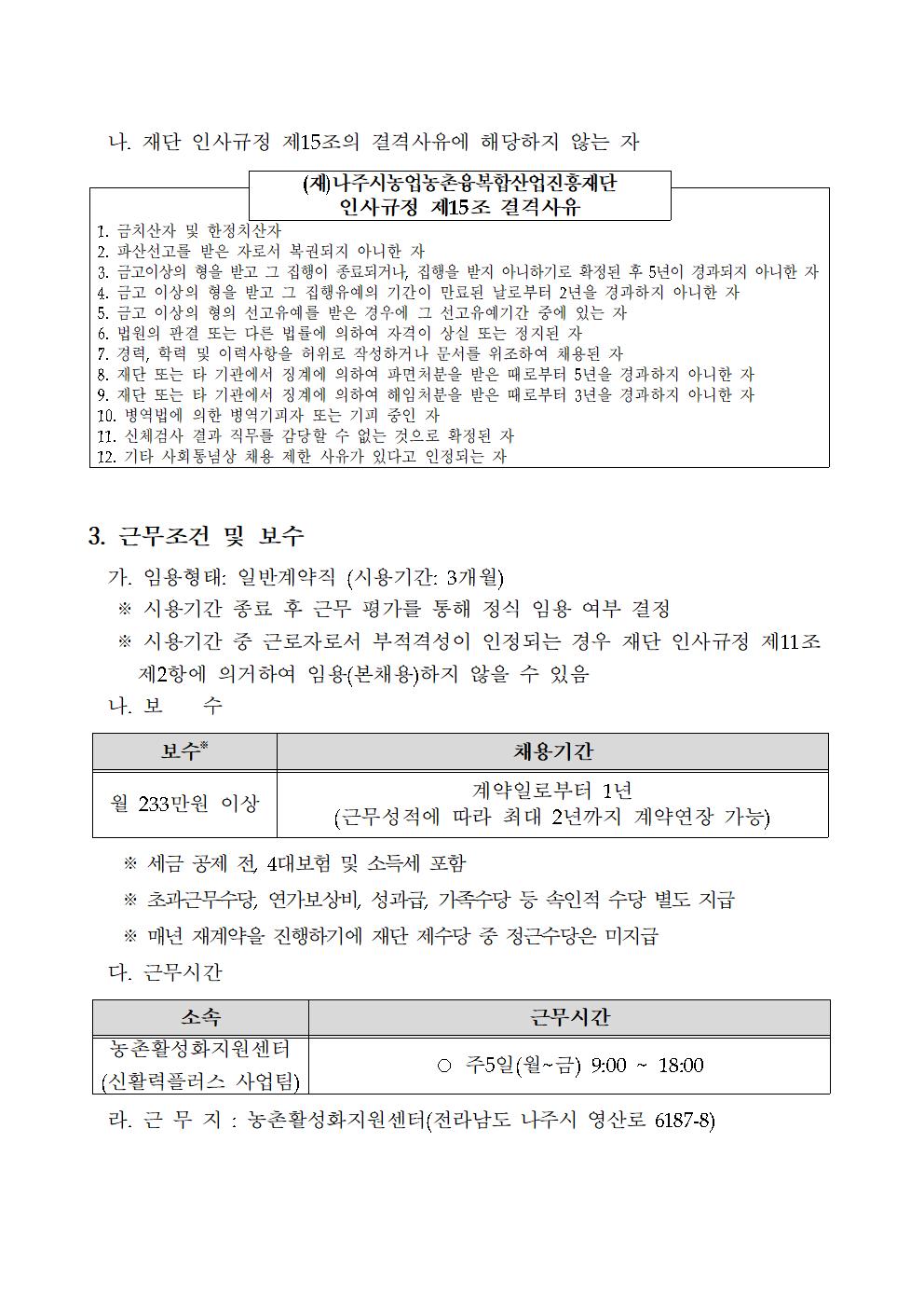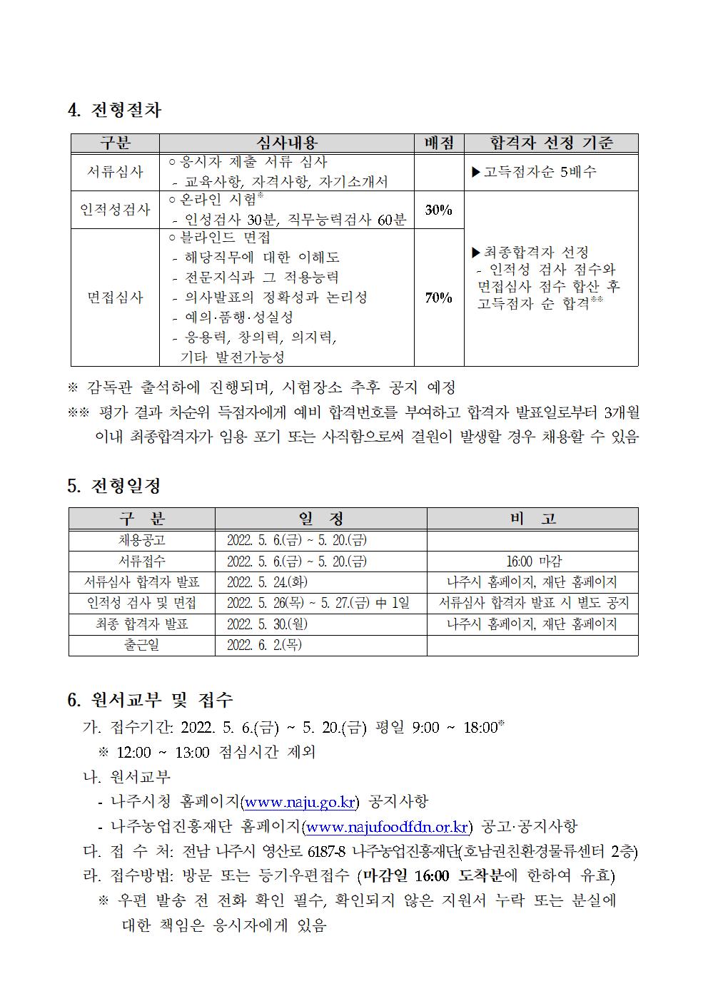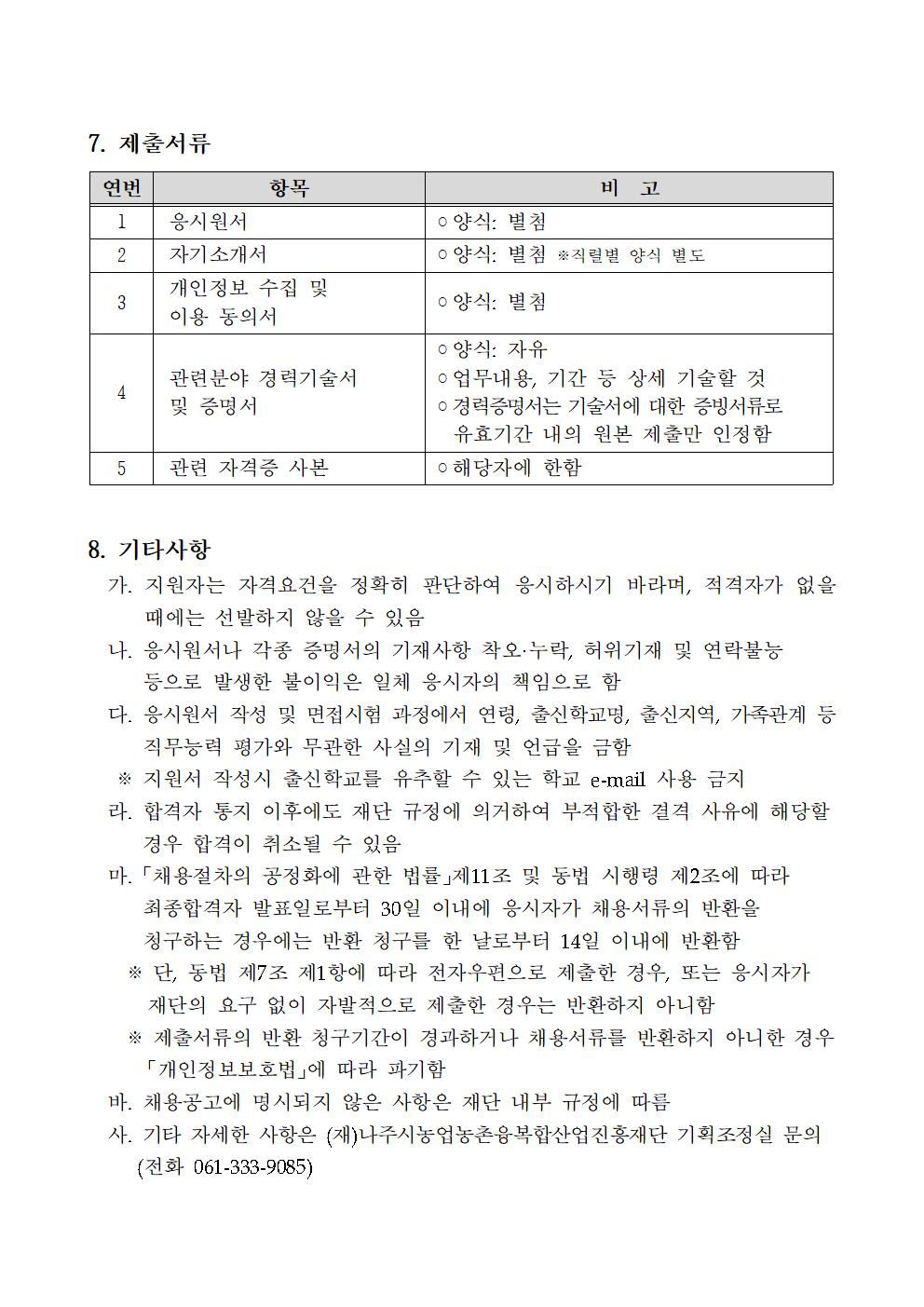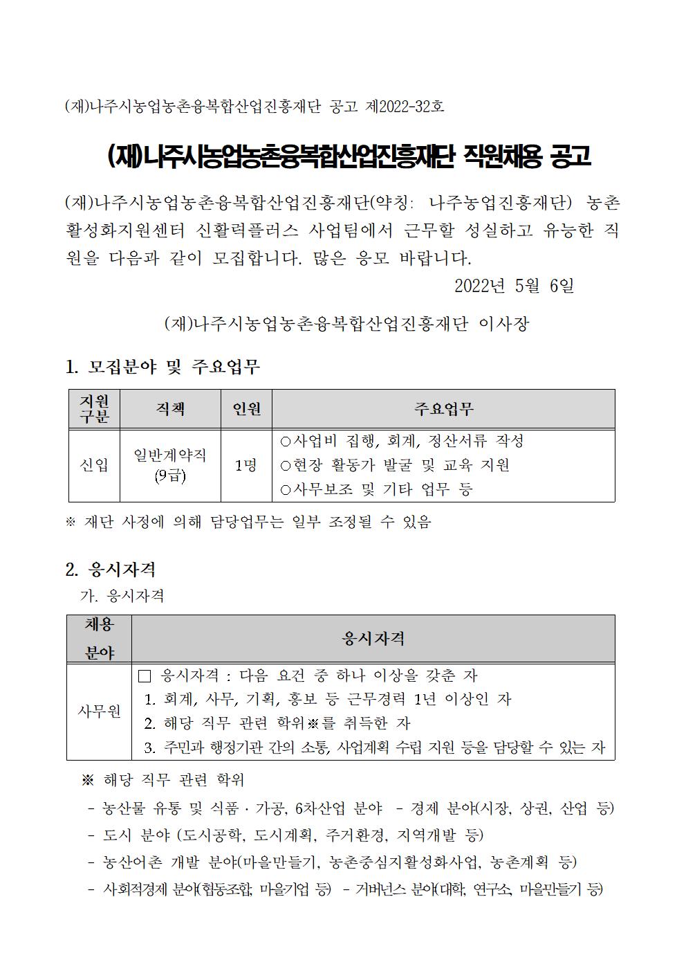 (재)나주시농업농촌융복합산업진흥재단 신활력플러스 사업팀 직원 채용 공고 2022.05.06 09:46 File 붙임 2.자기소개서.hwp (14 KB) 붙임 3.응시원서 및 개인정보수집및이용동의서 양식 (공통양식).hwp (17 KB) 다음글 : 나주농업진흥재단 로컬푸드지원센터 기간제근로자 채용 공고 이전글 : 『나주시 농촌 신활력플러스사업』 2022년 상생푸드 아카데미 용역 제안서 평가점수 공개