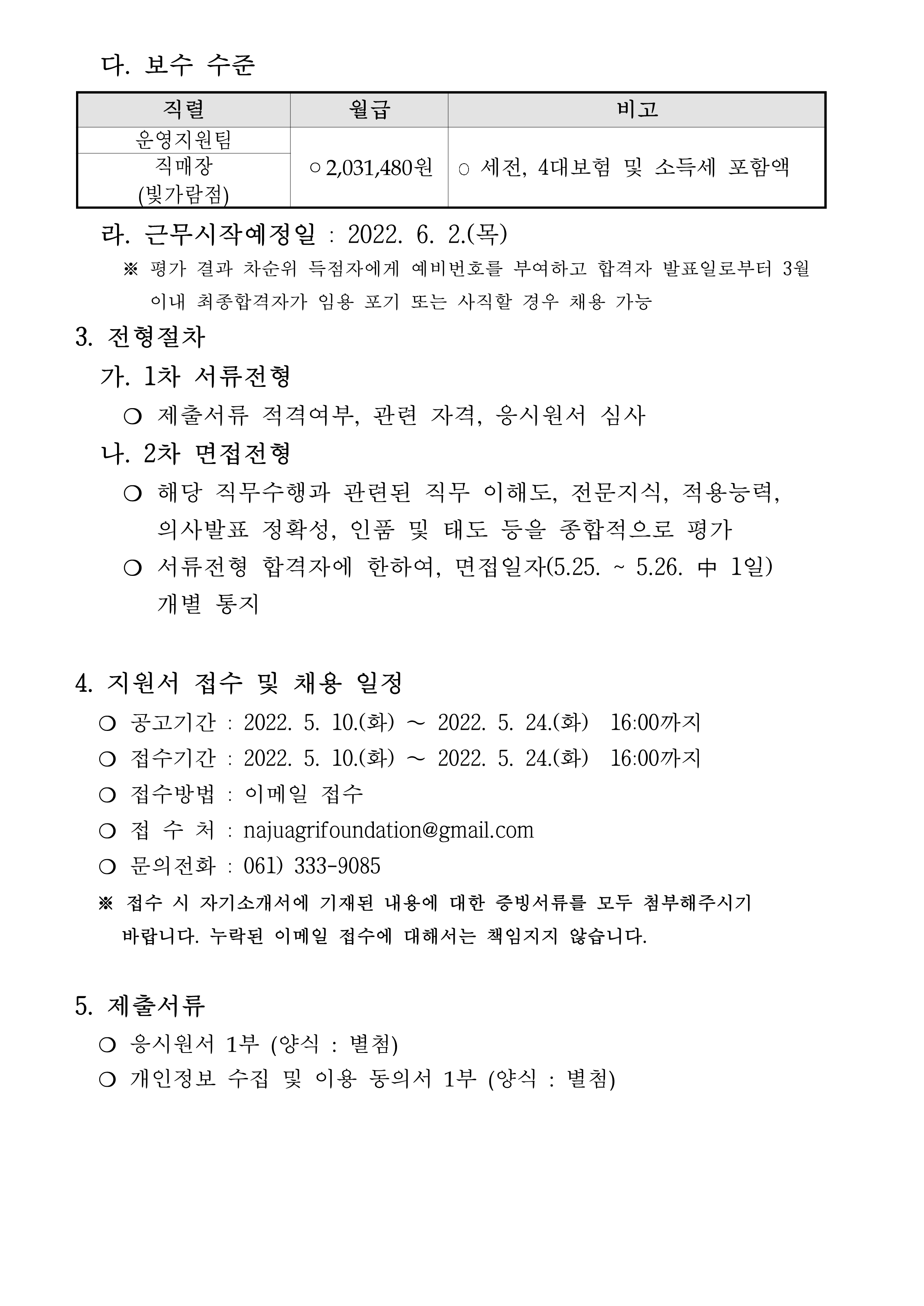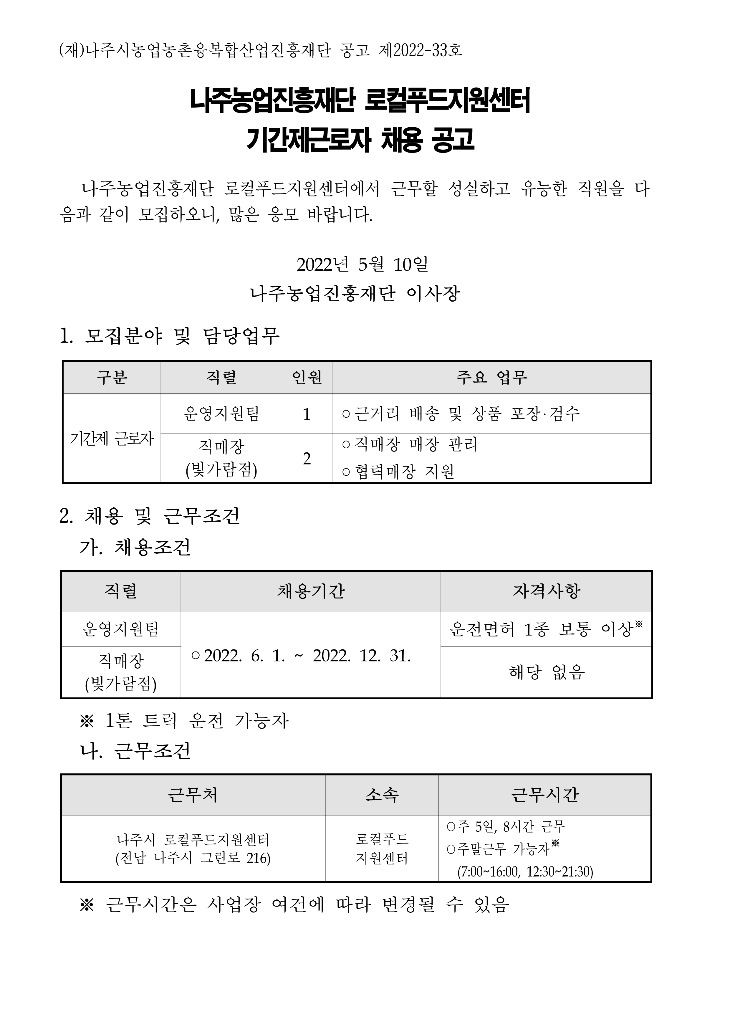나주농업진흥재단 로컬푸드지원센터 기간제근로자 채용 공고 2022.05.10 15:42 File 붙임. 응시원서 및 개인정보 수집 및 이용 동의서.hwp (17.5 KB) 다음글 : 천연색소 경쟁력강화 지원사업 2차 공모 이전글 : (재)나주시농업농촌융복합산업진흥재단 신활력플러스 사업팀 직원 채용 공고